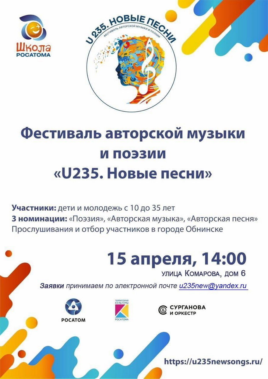 15 апреля в 14:00 в Школе креативных индустрий города Обнинска (ул. Комарова, 6) состоится очный творческий отбор Фестиваля авторской музыки и поэзии «U-235. Новые песни» авторов музыки, стихов, песен. Председатель жюри – Светлана Сурганова. Возрастной диапазон участников – от 10 до 35 лет.