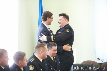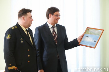 8 мая состоялась встреча главы Администрации города Александра Авдеева с экипажем атомной подводной лодки, носящей имя нашего города. Визит носил ответный характер, - в 2011 году делегация Обнинска посетила город Заозерск Мурманской области, где базируется АПЛ, чтобы вручить морякам в подарок грузопассажирский автомобиль «Соболь». В ходе этой поездки телекомпанией «Крылья» был снят небольшой фильм, который смогли посмотреть участники мероприятия.