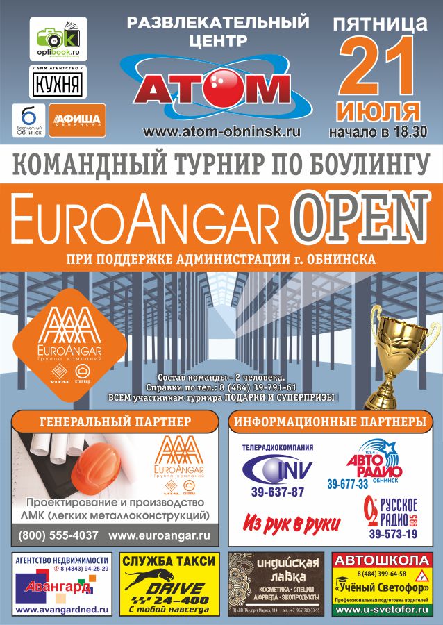 Боулинг-центр «Атом» приглашает Вашу команду из 2 человек для участия в открытом любительском командном турнире по боулингу «Euroangar Open - 2017»!