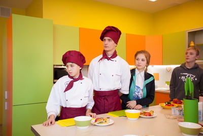 По дизайн-проекту изготовили кухонную мебель. Установлен кухонный «остров» для коллективных занятий детей по кулинарии. Кухня укомплектована необходимой бытовой техникой: холодильником, духовым шкафом, электроплитами, мультиваркой, микроволновкой, блендерами, электрочайниками. В интернат передано все необходимое для приготовления различных блюд: набор кастрюль, набор столовых приборов, ножи, разделочные доски, сервировочная посуда, сковородки и многое другое.