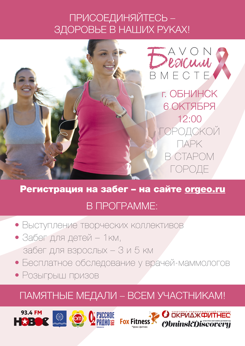 6 октября в 12.00 в Городском парке Старого города (г. Обнинск) пройдет забег в поддержку Миссии Avon против рака груди «Бежим вместе». Это семейный забег, призванный популяризовать культуру ответственного отношения к здоровью и привлечь внимание к проблеме рака молочной железы – самого распространенного среди женщин онкологического заболевания.