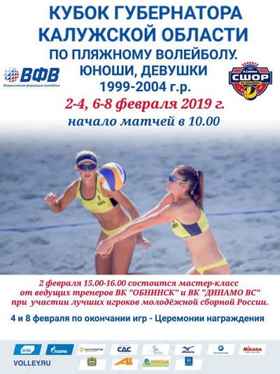 2-4, 6-8 февраля в СШОР по волейболу А.Савина пройдет Кубок Губернатора Калужской области по пляжному волейболу среди юношей и девушек 1999-2004 г.р.. Начало матчей в 10-00. 2 февраля состоится мастер-класс от ведущих тренеров ВК «Обнинск» и ВК «Динамо ВС» при участии лучших игроков молодежной сборной России. 4 и 8 февраля по окончании игр состоится церемония награждения.