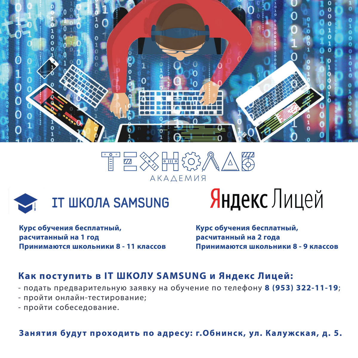 Уже третий год подряд на базе «Академии Технолаб» две мощнейших компании из области IT ведут набор школьников на образовательные курсы. Все занятия абсолютно бесплатны, но чтобы получить обучение по программам «Яндекс.Лицей» и «IT-школа Samsung» придется пройти отбор.