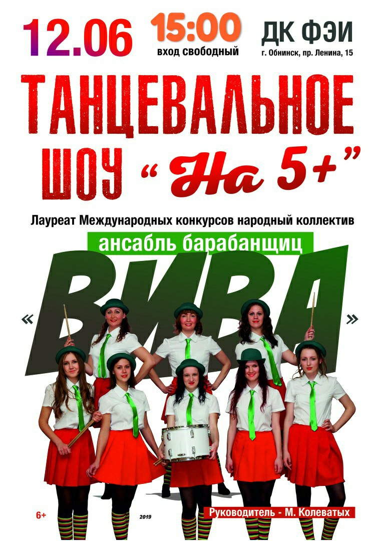 Дом культуры ФЭИ приглашает на концерт «Нам 5 лет», посвященный Дню России, Лауреата международных и всероссийских конкурсов народного коллектива ансамбля барабанщиц «Вива» (руководитель – М.В. Колеватых).