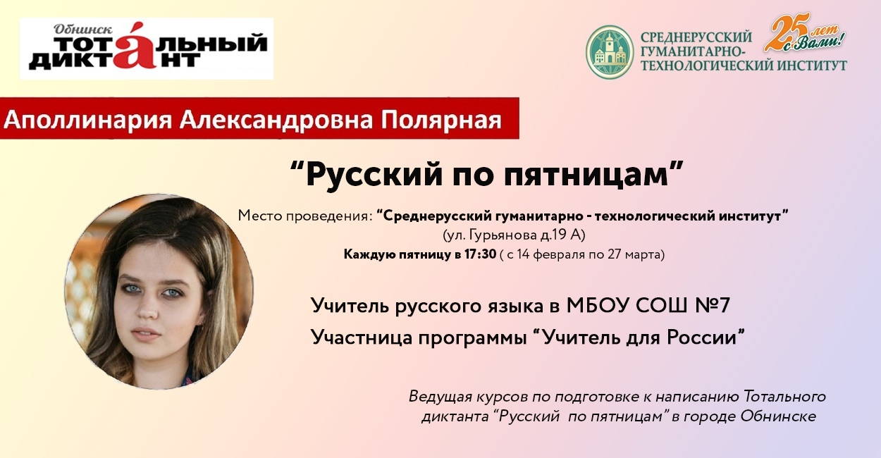 14 февраля в Обнинске стартуют курсы подготовки к Тотальному диктанту – 2020 «Русский по пятницам». Строго говоря, посещать курсы может любой желающий: курсы помогут повысить уровень своей грамотности, развить коммуникативные навыки и завести новые знакомства.