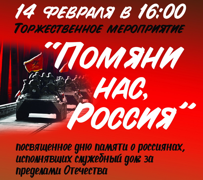 14 февраля в 16-00 в Доме культуры ФЭИ состоится торжественное мероприятие «Помяни нас, Россия», посвященное Дню памяти о россиянах, исполнявших служебный долг за пределами Отечества.