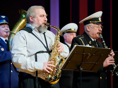 Еще до начала мероприятия в фойе ГДК зрители могли ознакомиться с выставкой работ детской художественной школы под музыку муниципального духового оркестра ДК ФЭИ.