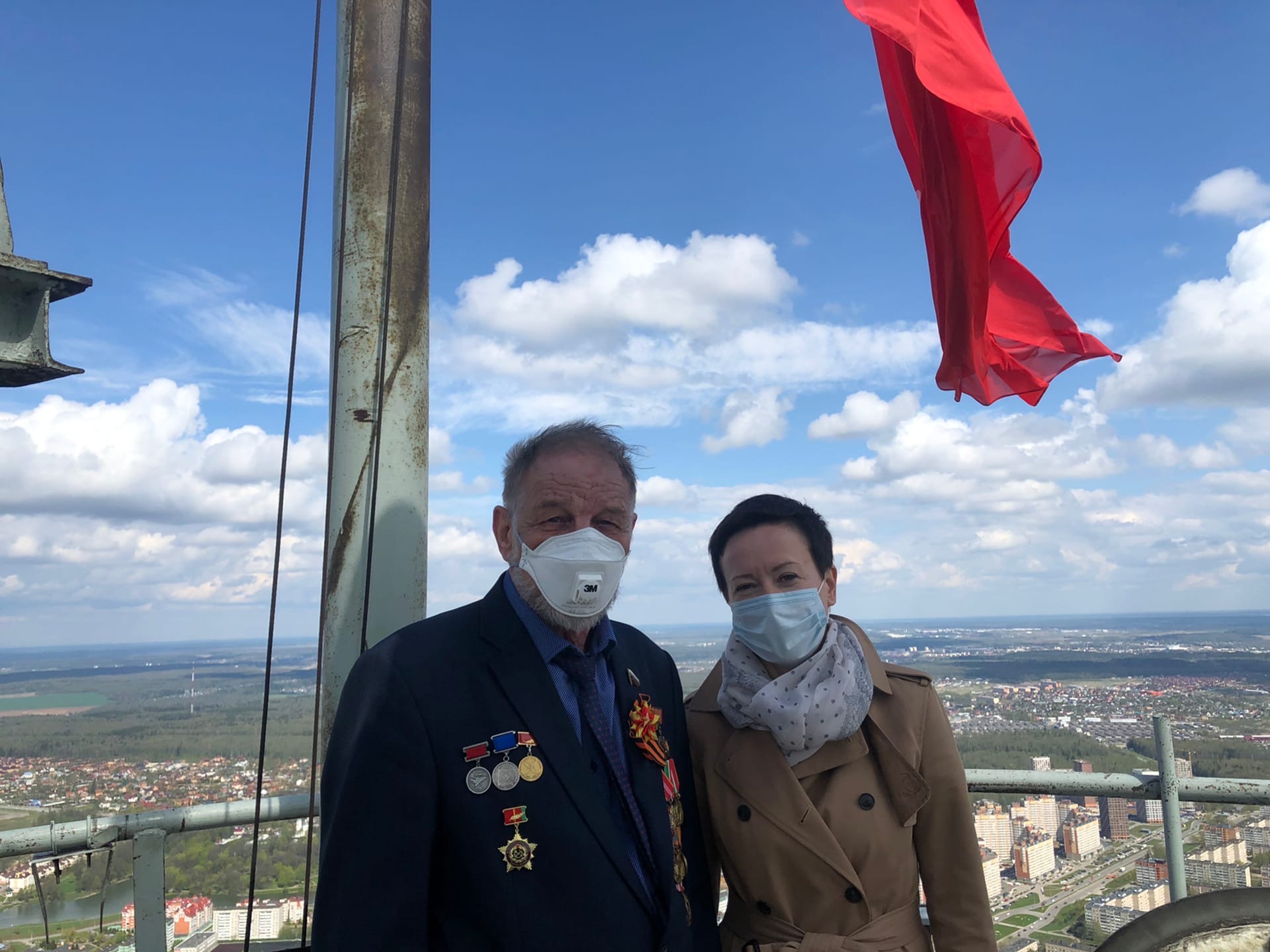7 мая Знамя торжественно установили на метеомачту и.о. главы Администрации города Карина Башкатова и председатель обнинского городского Совета ветеранов Николай Капустин.