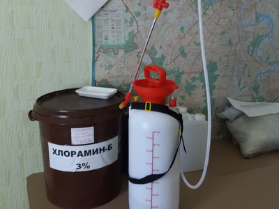 - для текущей, профилактической, заключительной дезинфекции технологического оборудования, поверхностей, инвентаря, воздуха и спецодежды используется препарат «Хлорамин-Б»;