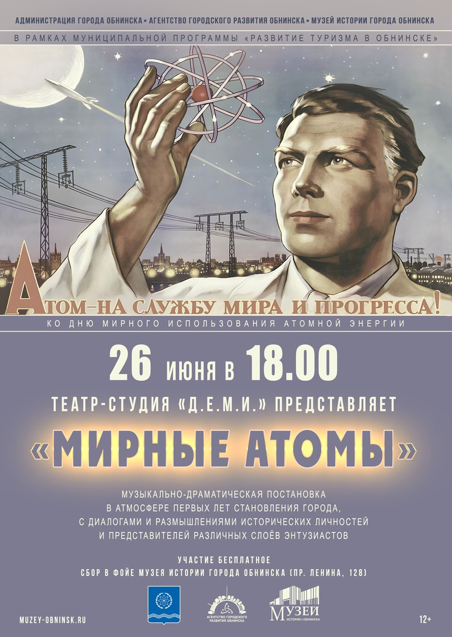 26 июня в 18:00 в Музее истории города Обнинска Театр-студия «Д.Е.М.И.» представит спектакль «Мирные атомы».