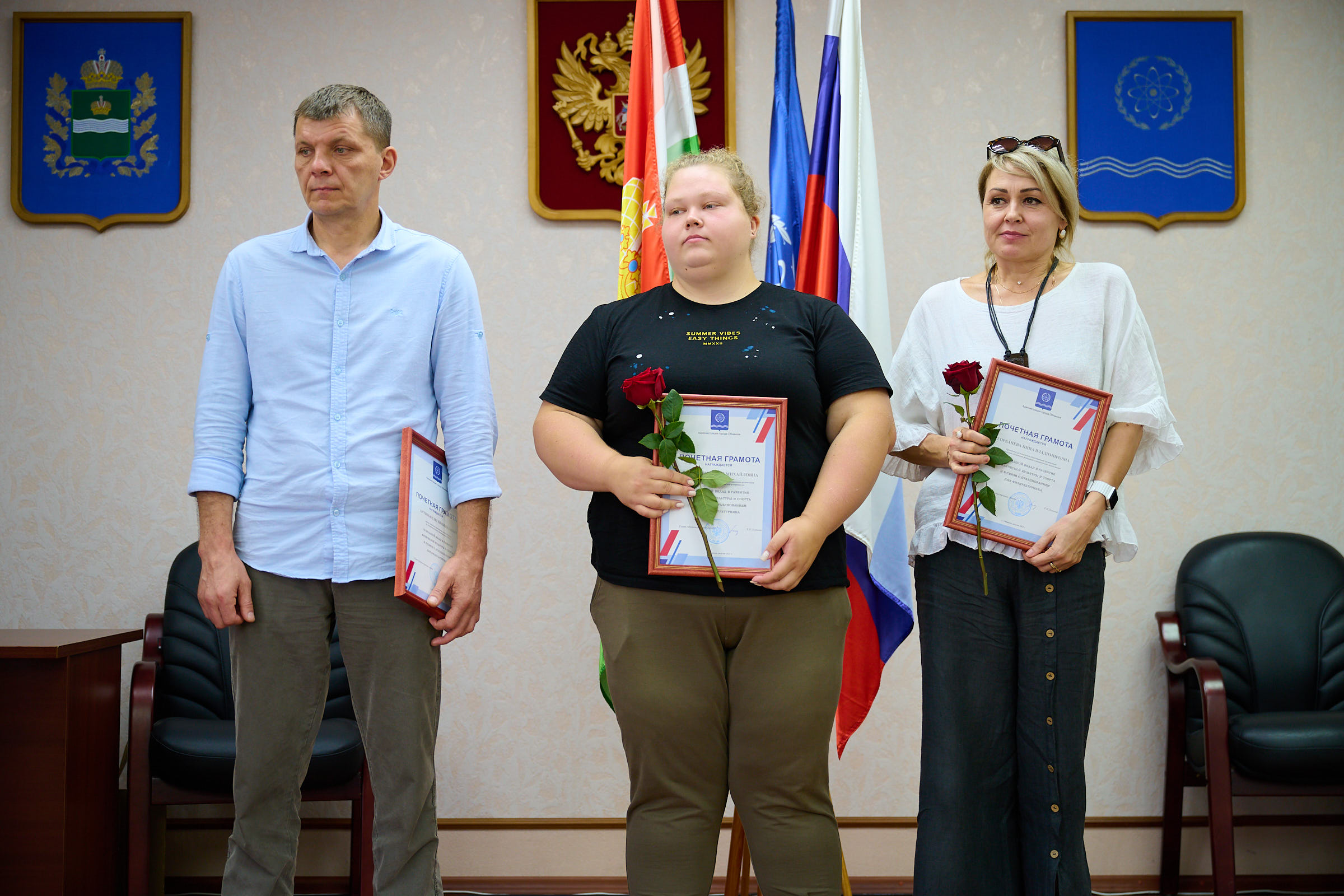 16 июля в Администрации города прошла торжественная церемония вручения почётных грамот лицам, внесшим значительный вклад в спортивную жизнь Обнинска и в связи с празднованием Всероссийского Дня физкультурника.