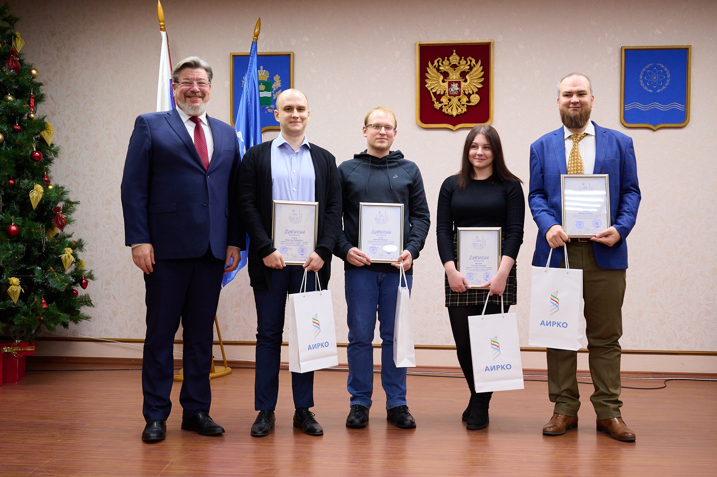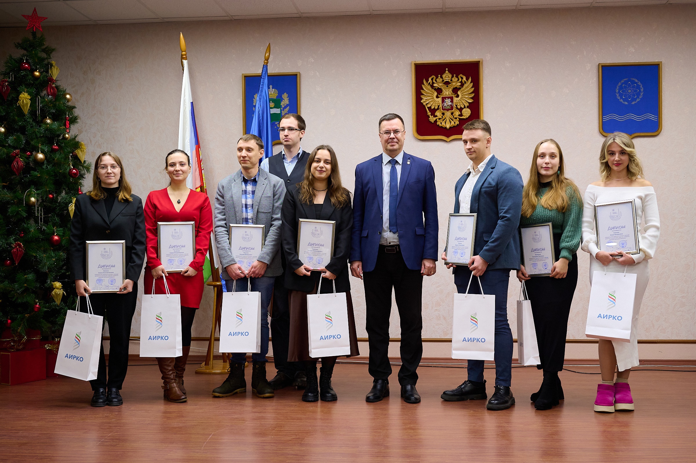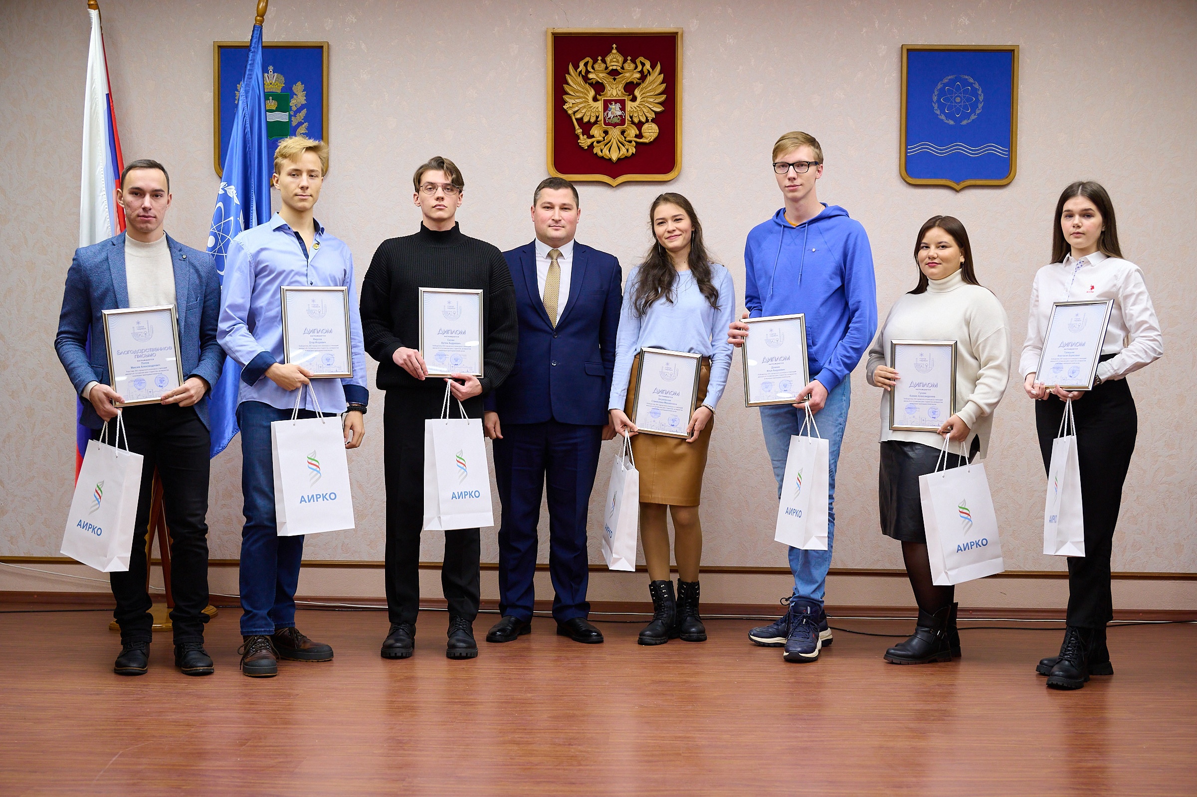 Генеральный директор АО «АИРКО» Павел Гранков вручил диплом победителя XXI городского конкурса стипендий для студентов, аспирантов и молодых преподавателей имени А.А. Сотникова в номинации «Студенты 2-4 курса» и стипендией в размере 11000 рублей Галицына Анастасия Борисовна, Гусева Ксения Александровна, Домнин Илья Андреевич, Заграевская Станислава Михайловна, Силин Артем Андреевич, Фирсов Егор Игоревич.