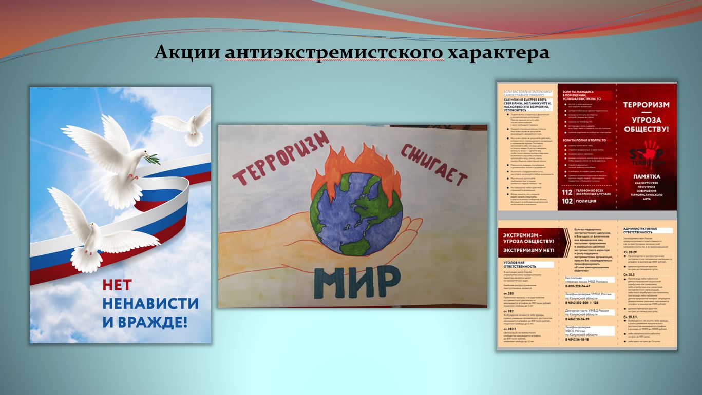 В этом году совместно с УМВД России по Калужской области продолжится распространение информационных материалов по профилактике экстремизма, а также и пресечение фактов проведения противоправной агитации и распространения материалов экстремистского содержания.