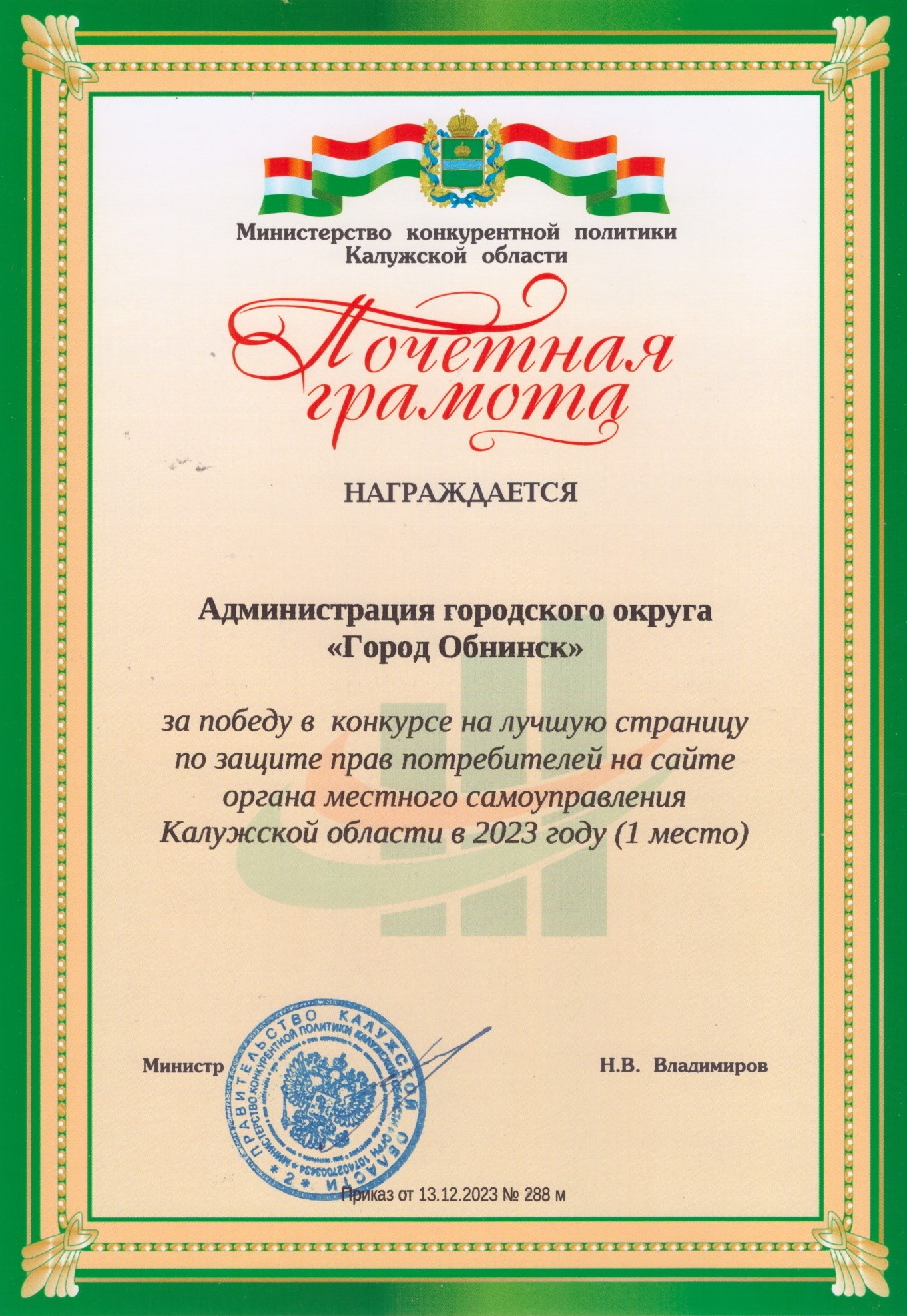 В Калуге подвели итоги ежегодного конкурса на лучшую страницу по защите прав потребителей на сайте органа местного самоуправления Калужской области в 2023 году. Администрация города Обнинска заняла 1 место и награждена Почетной Грамотой Министерства конкурентной политики Калужской области за наполнение информационным содержанием в сфере защиты прав потребителей официального сайта органа местного самоуправления в информационно-телекоммуникационной сети Интернет.