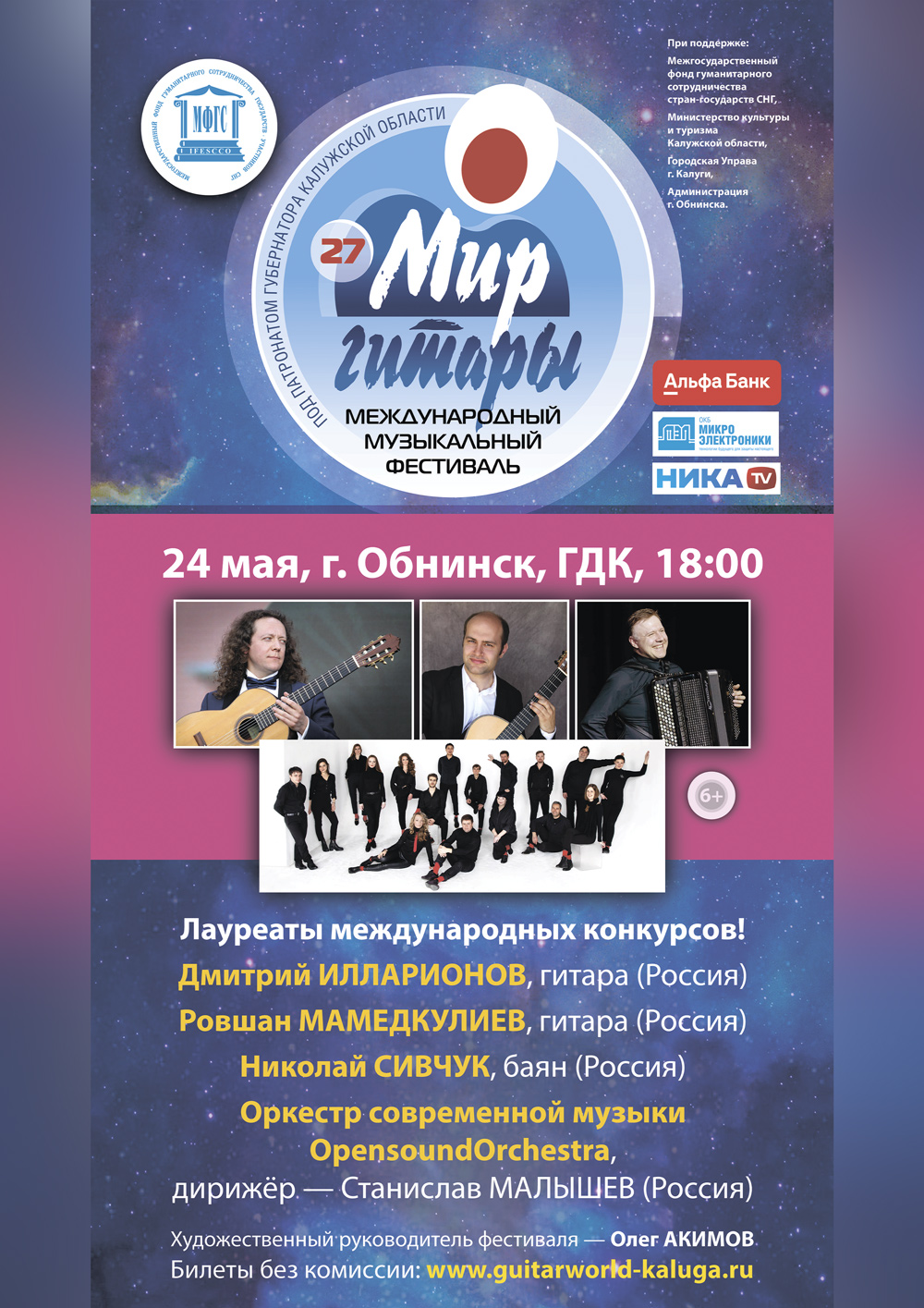 24 мая в 18:00 в рамках 27 международного музыкального фестиваля «Мир гитары» в Городском Дворце Культуры состоится концерт «Шедевры гитарной классики». В концерте принимают участие лауреаты международных конкурсов Дмитрий Илларионов и Ровшан Мамедкулиев (гитара), Николай Сивчук (баян) и оркестр современной музыки OpensoundOrchestra, дирижёр – Станислав Малышев.
