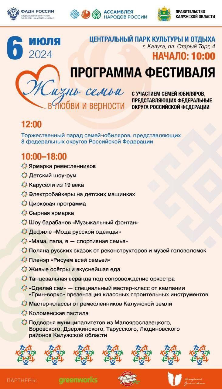 Тематические площадки будут работать с 10.00 до 18.00. В 12.00 состоится торжественный парад семей-юбиляров, представляющих все федеральные округа России. С 19.00 до 21.00 на главной сцене Гостиного двора по приглашению общероссийской общественно-государственной организации «Ассамблея народов России» выступят народный артист Олег Погудин, концертный оркестр Алексея Губарева, победитель телевизионного проекта «Голос» Алиса Игнатьева, фолк-группа «Партизан FМ».