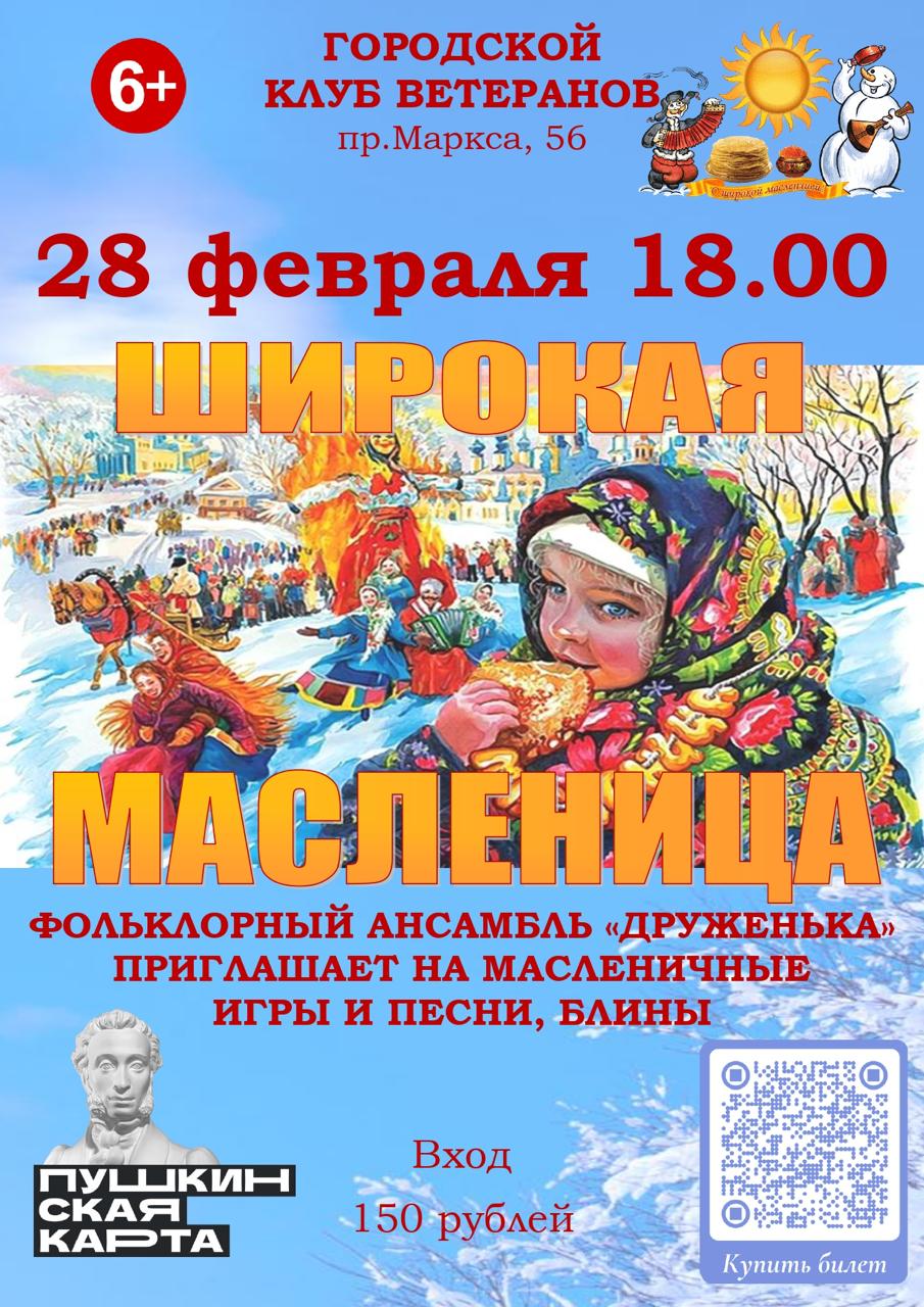 28 февраля в 18:00 Фольклорный ансамбль «Друженька» приглашает на масленичные игры, песни, блины в Городской клуб ветеранов.