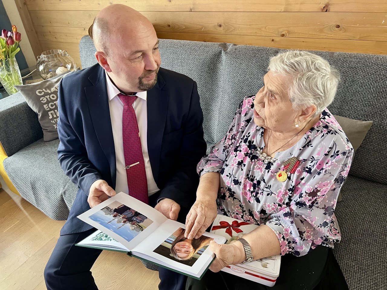 Заместитель главы Администрации города по социальным вопросам Константин Пахоменко вручил юбилейную медаль в честь 80-летия Победы ветерану Великой Отечественной войны, труженице тыла Зинаиде Филипповне Хомяковой.