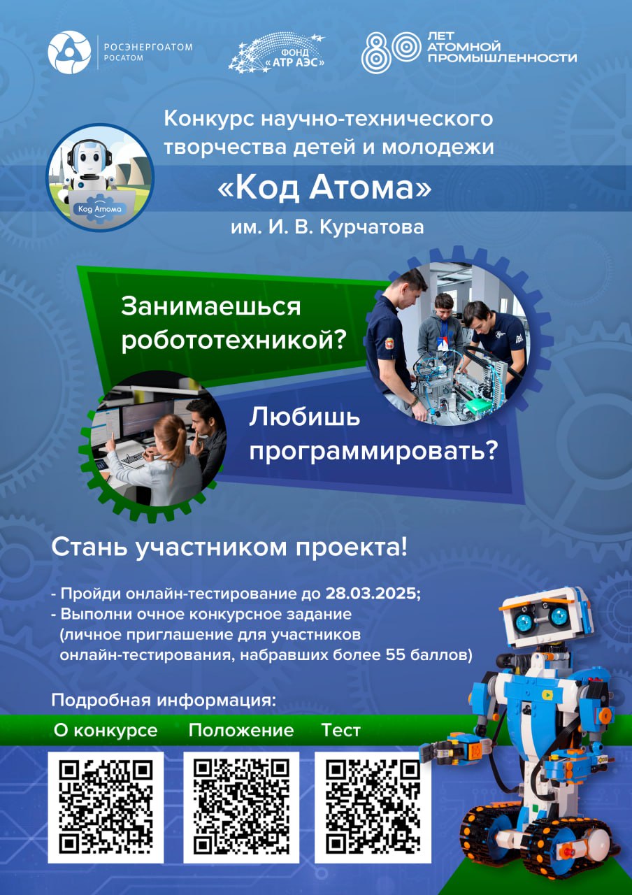 Фонд «АТР АЭС» объявил о старте III конкурса научно-технического творчества детей и молодежи «Код Атома» им. И.В. Курчатова (ранее «ИнженериУм). В проекте могут принять участие подростки в возрасте от 12 до 17 лет, проживающие в городах расположения атомных электростанций России. Отборочные туры пройдут с 13 марта по 11 апреля 2025 г. Сильнейшие участники от каждого города будут объединены в команды по пять человек для дальнейшего обучения и защиты проектов на фестивале «Код Атома», который состоится в Москве в январе 2026 года.