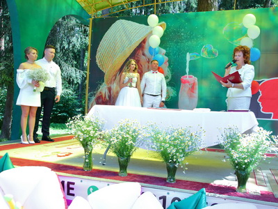 В этом году торжественная регистрация заключения брака проходила на площадке Городского парка в Старом городе. Две пары молодых обнинцев изъявили желание провести церемонию бракосочетания на открытом воздухе. Место проведения церемонии было празднично украшено живыми букетами ромашек - символом праздника, воздушными шарами цветов флага России. Звучала музыка и рассказ об истории праздника.