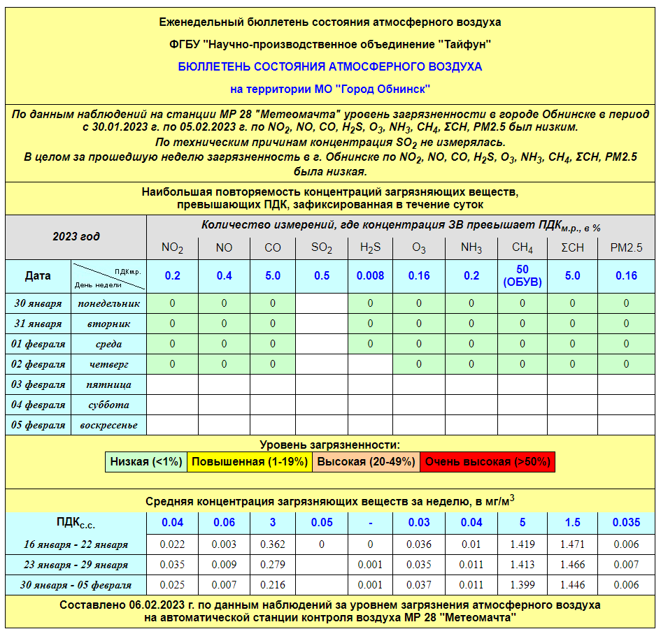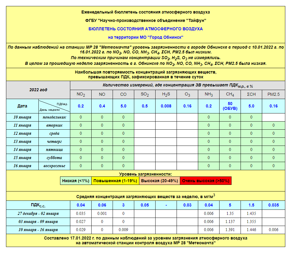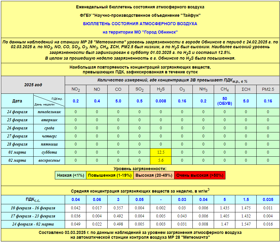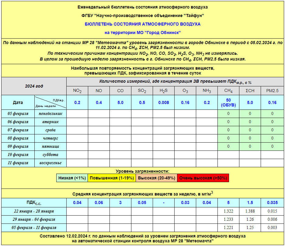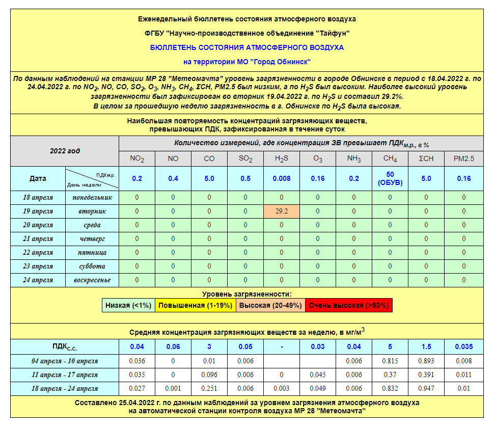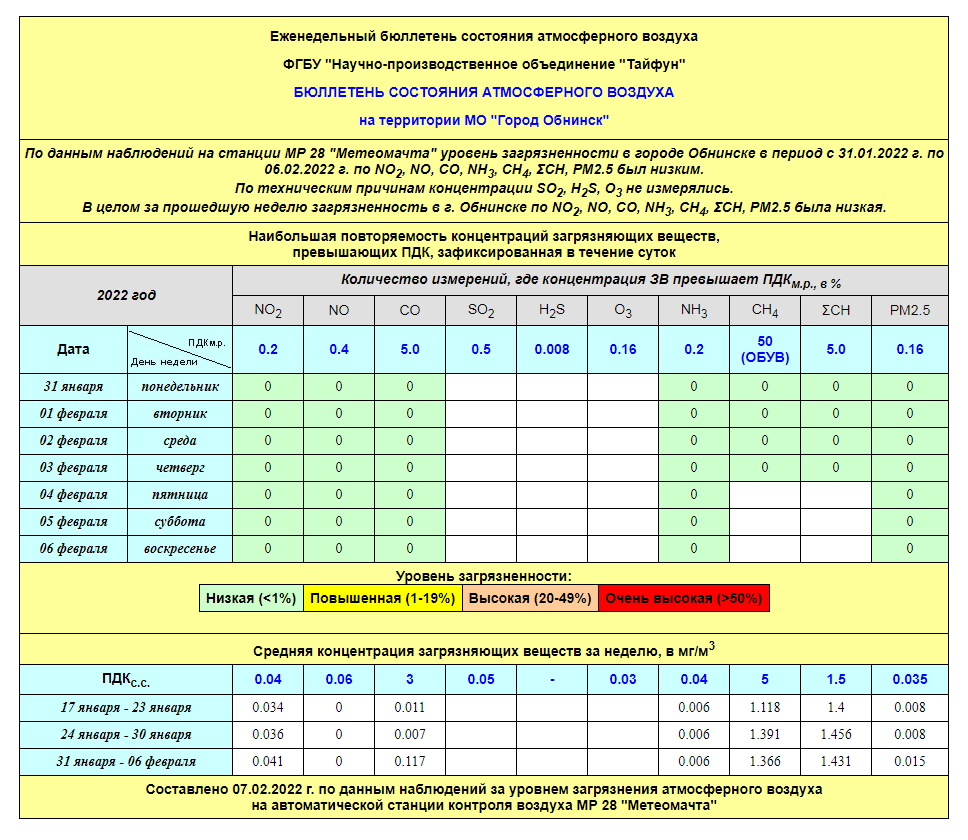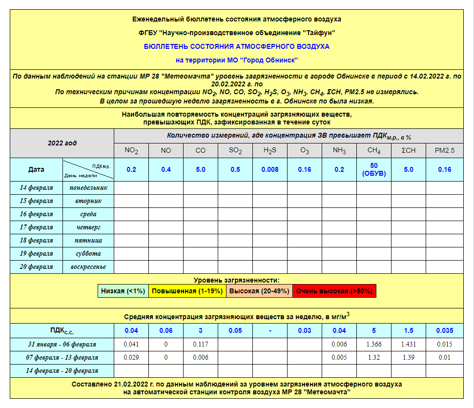 По информации, предоставленной ФГУП НПО «Тайфун», отмеченные в бюллетене состояния атмосферного воздуха на территории МО «Город Обнинск» превышения концентрации по H2S (сероводород) за период с 08.02.-12.02. связаны с некорректной работой прибора. В настоящее время проводятся работы по технической диагностике прибора.