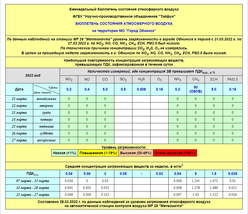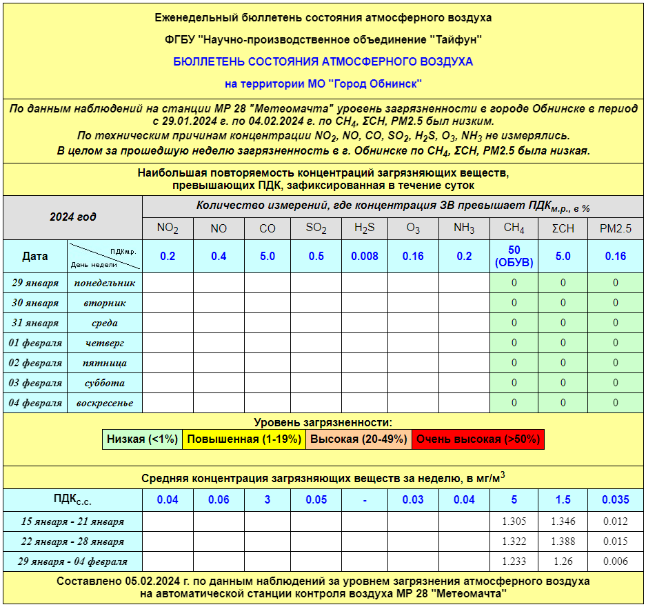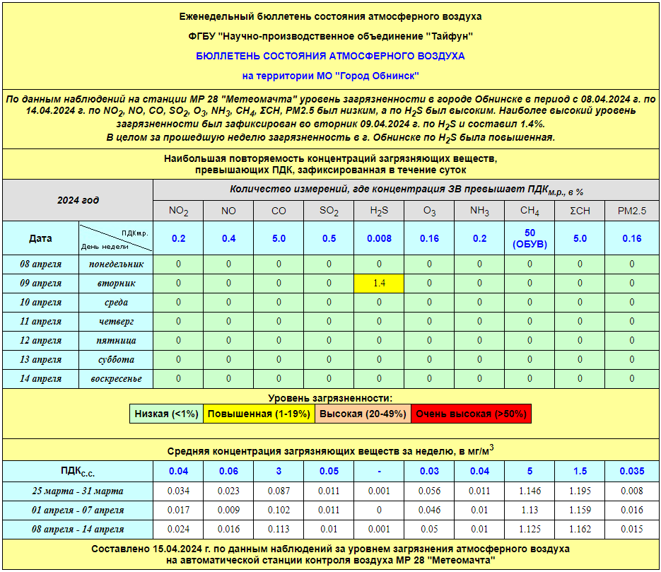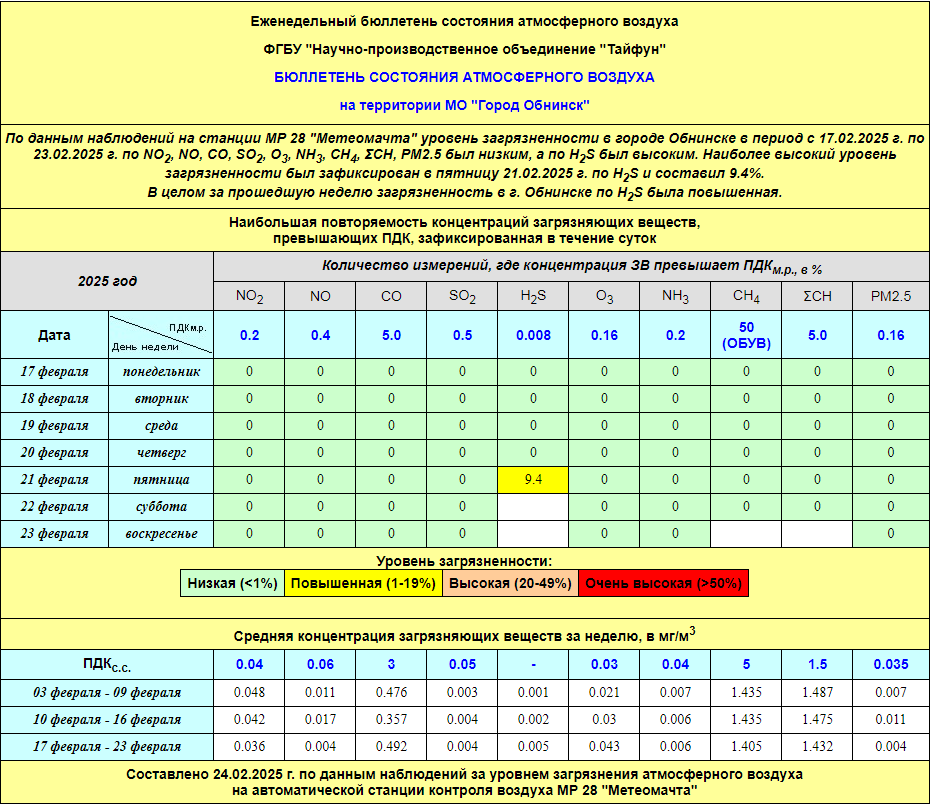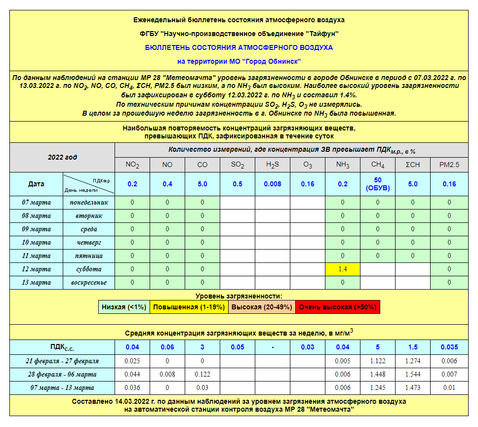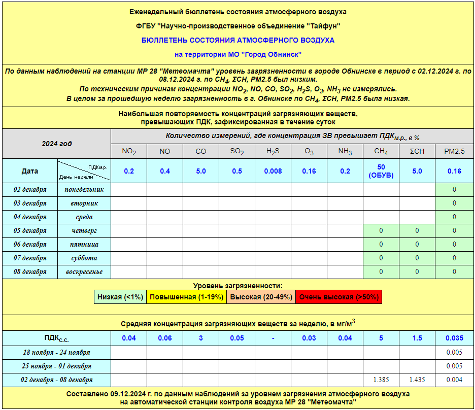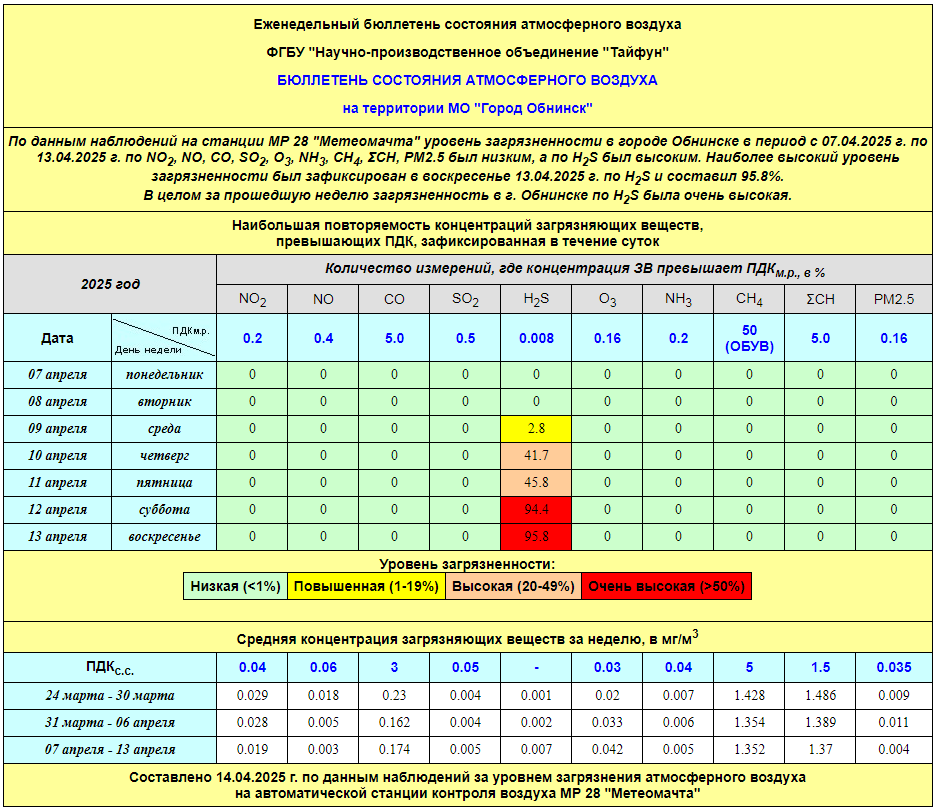 По информации, предоставленной ФГУП НПО «Тайфун», отмеченные в бюллетене состояния атмосферного воздуха на территории МО «Город Обнинск» превышения концентрации по H2S (сероводород) за период с 08.02.-12.02. связаны с некорректной работой прибора. В настоящее время проводятся работы по технической диагностике прибора.