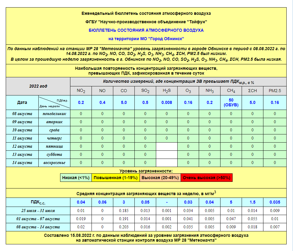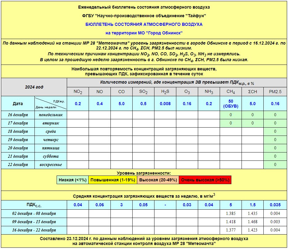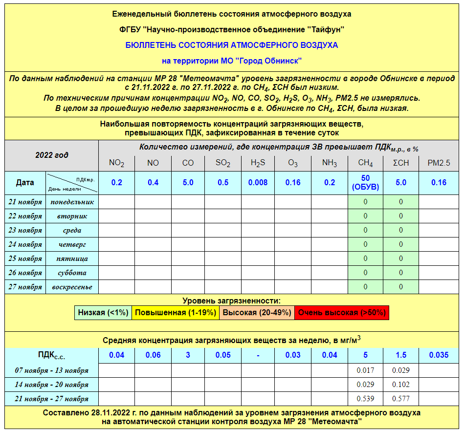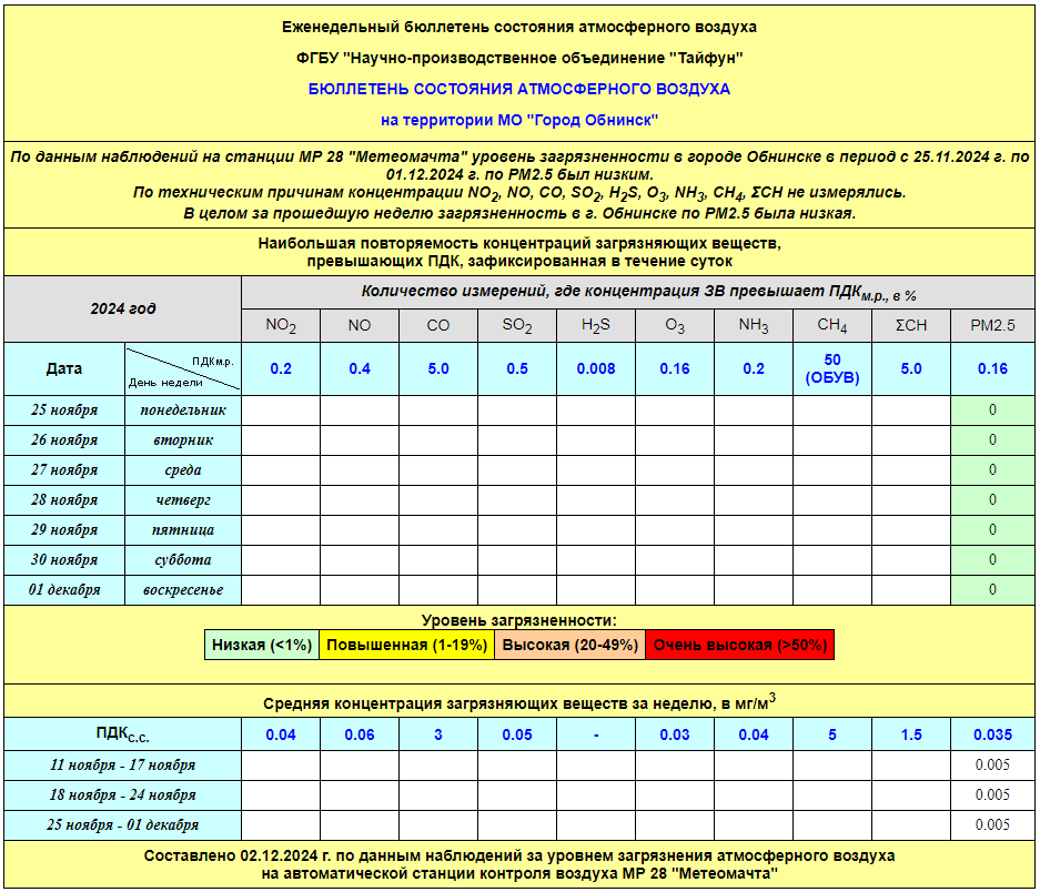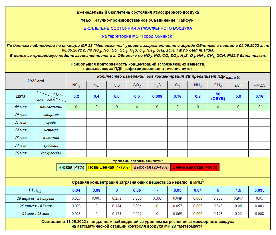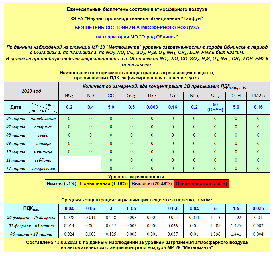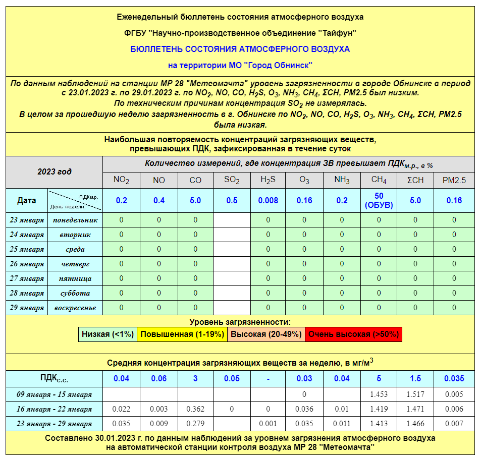 По информации, предоставленной ФГУП НПО «Тайфун», отмеченные в бюллетене состояния атмосферного воздуха на территории МО «Город Обнинск» превышения концентрации по H2S (сероводород) за период с 08.02.-12.02. связаны с некорректной работой прибора. В настоящее время проводятся работы по технической диагностике прибора.