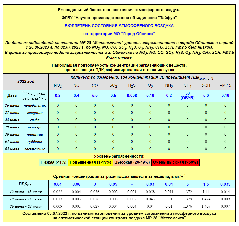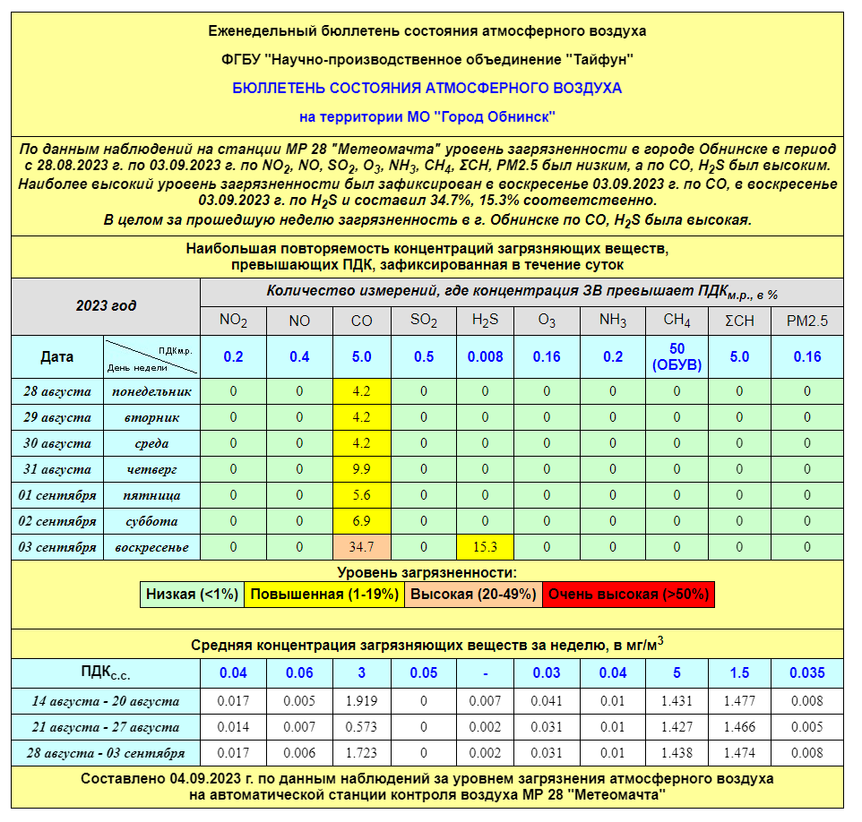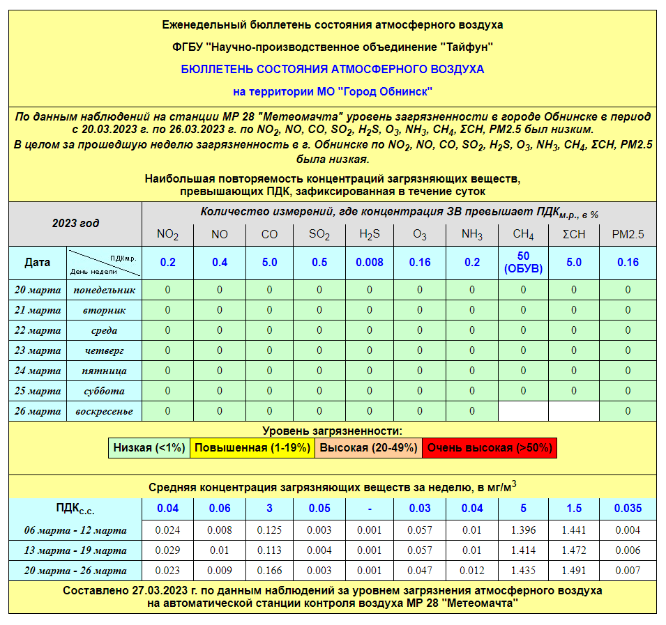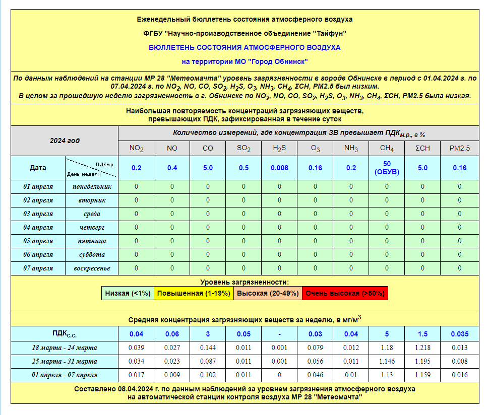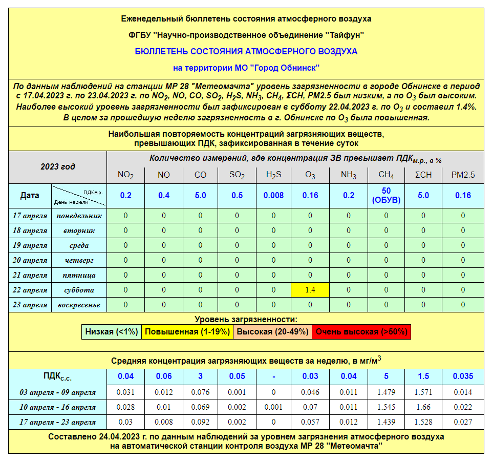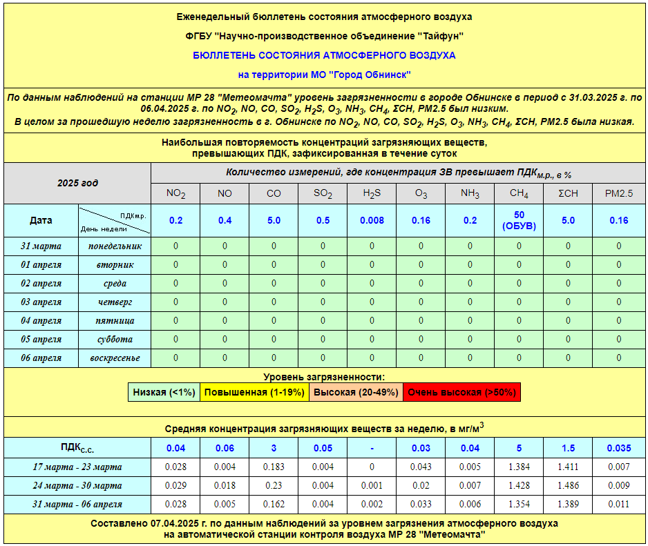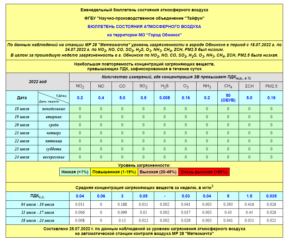 По информации, предоставленной ФГУП НПО «Тайфун», отмеченные в бюллетене состояния атмосферного воздуха на территории МО «Город Обнинск» превышения концентрации по H2S (сероводород) за период с 08.02.-12.02. связаны с некорректной работой прибора. В настоящее время проводятся работы по технической диагностике прибора.
