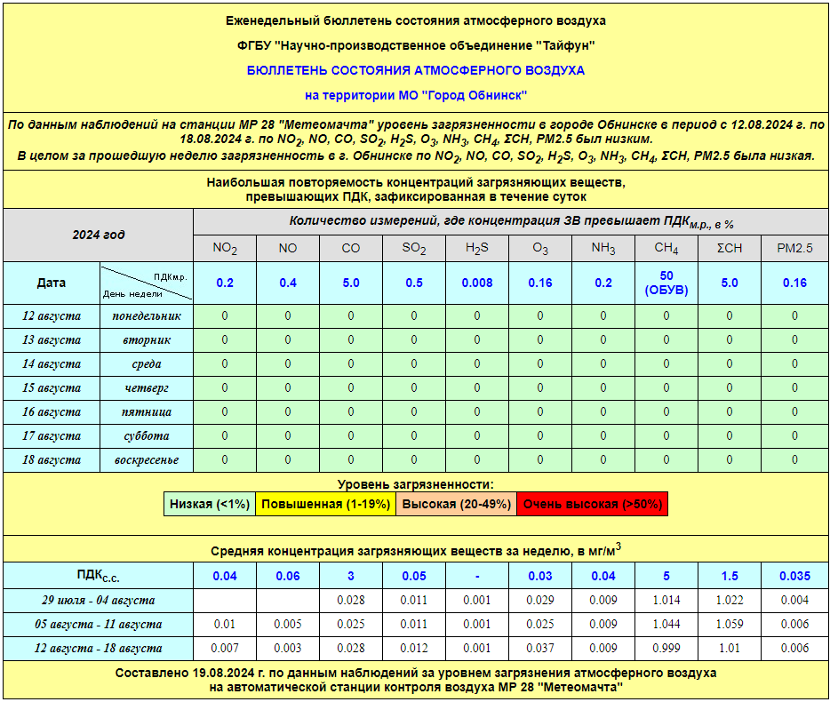 Уровень загрязнения атмосферного воздуха в г.Обнинске оценивается как низкий по ИЗА=2,8 (индекс загрязнения атмосферы).