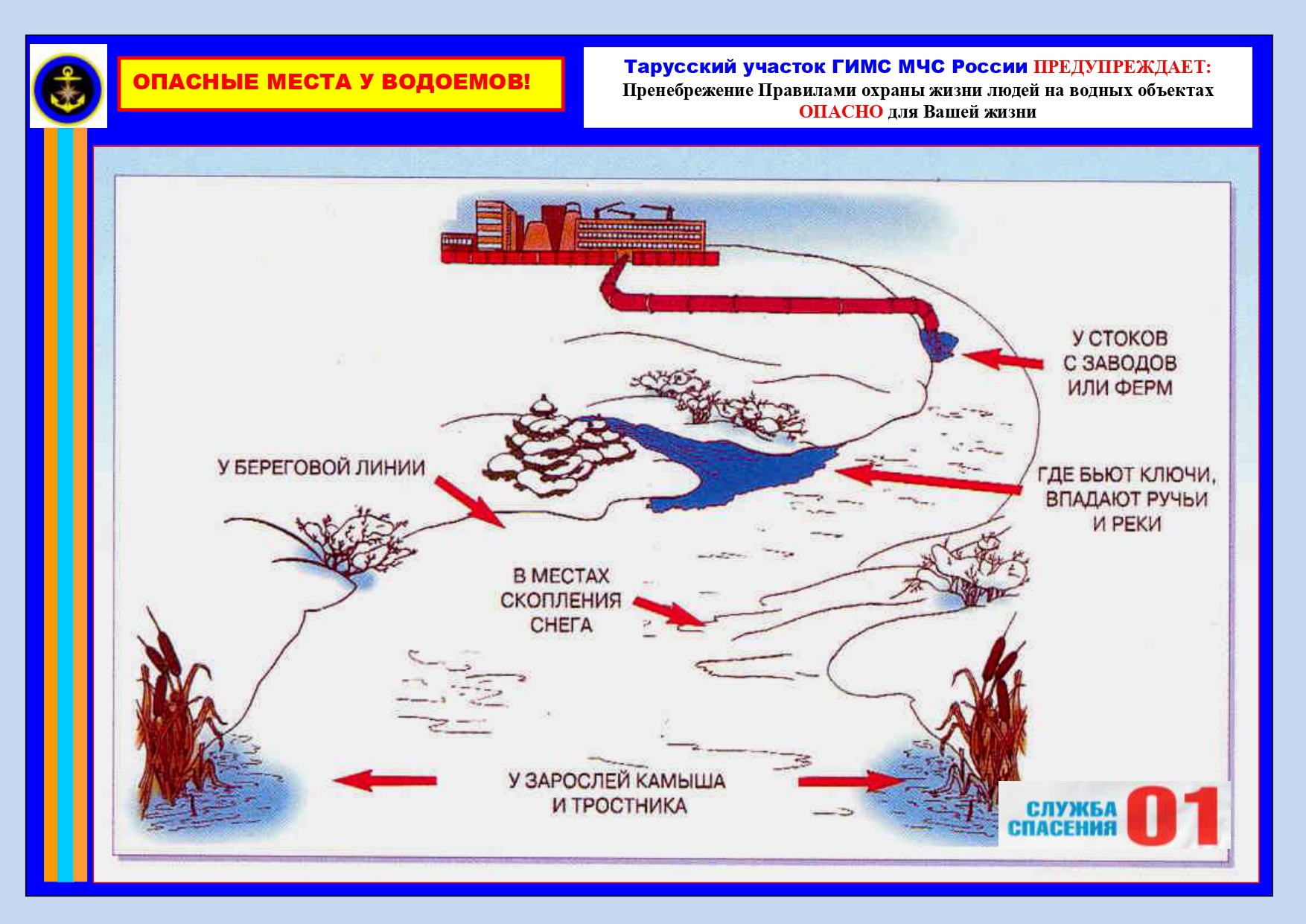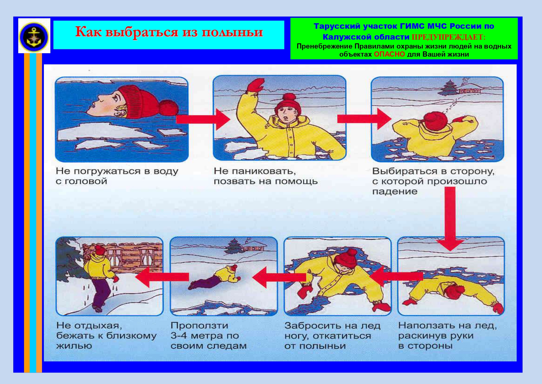 • Во время движения по льду следует обращать внимание на его поверхность, обходить опасные места и участки, покрытые толстым слоем снега. Особую осторожность необходимо проявлять в местах, где быстрое течение, родники, выступают на поверхность кусты, трава, впадают в водоем ручьи и вливаются теплые сточные воды промышленных предприятий, ведется заготовка льда и т.п. Безопасным для перехода пешехода является лед с зеленоватым оттенком и толщиной не менее 7 сантиметров.