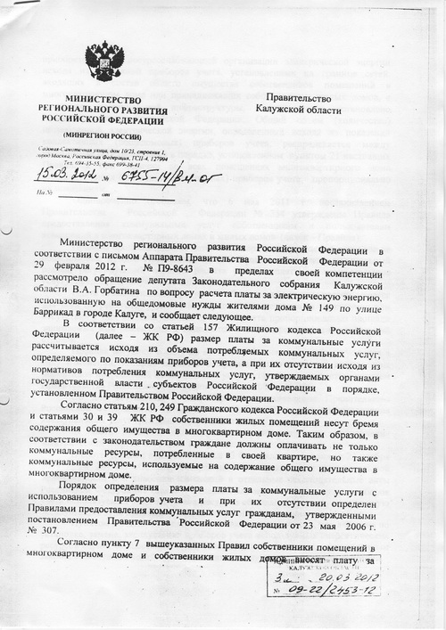 МИНРЕГИОН России по вопросу расчета платы за электрическую энергию