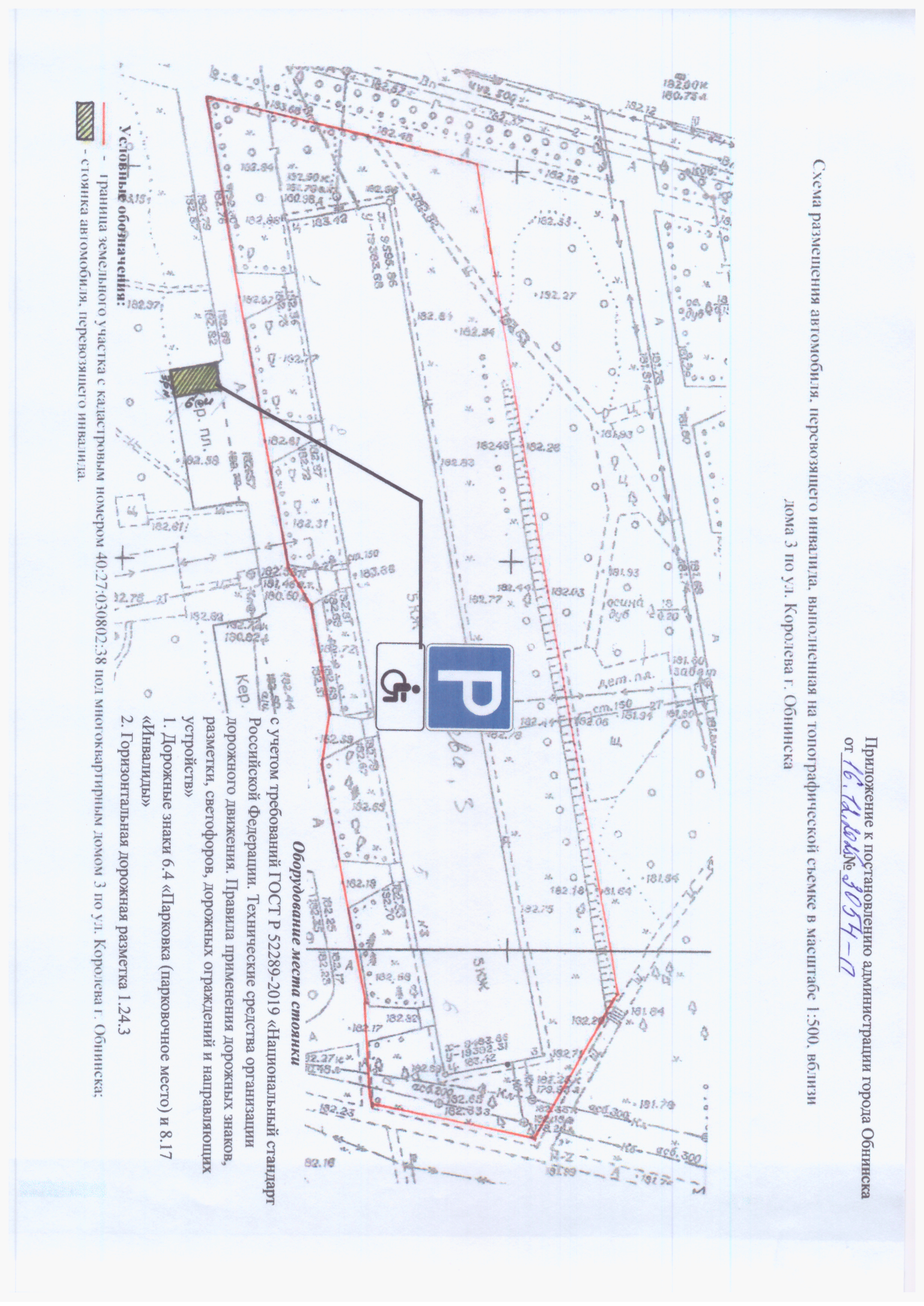 6. Заместителю главы администрации города Обнинска по вопросам городского хозяйства А.Ю.Беликову обеспечить оборудование места стоянки автомобиля, перевозящего инвалида, согласно утвержденной схеме: