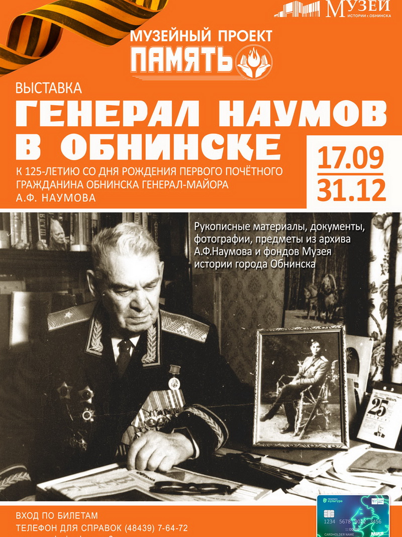 К 125-летию со дня рождения первого Почетного гражданина города Обнинска генерал-майора А.Ф. Наумова подготовлен музейный проект «Память», который пройдет с 17 сентября по 31 декабря 2022 года. В рамках проекта в Музее истории города Обнинска пройдет выставка «Генерал Наумов в Обнинске». (6+)