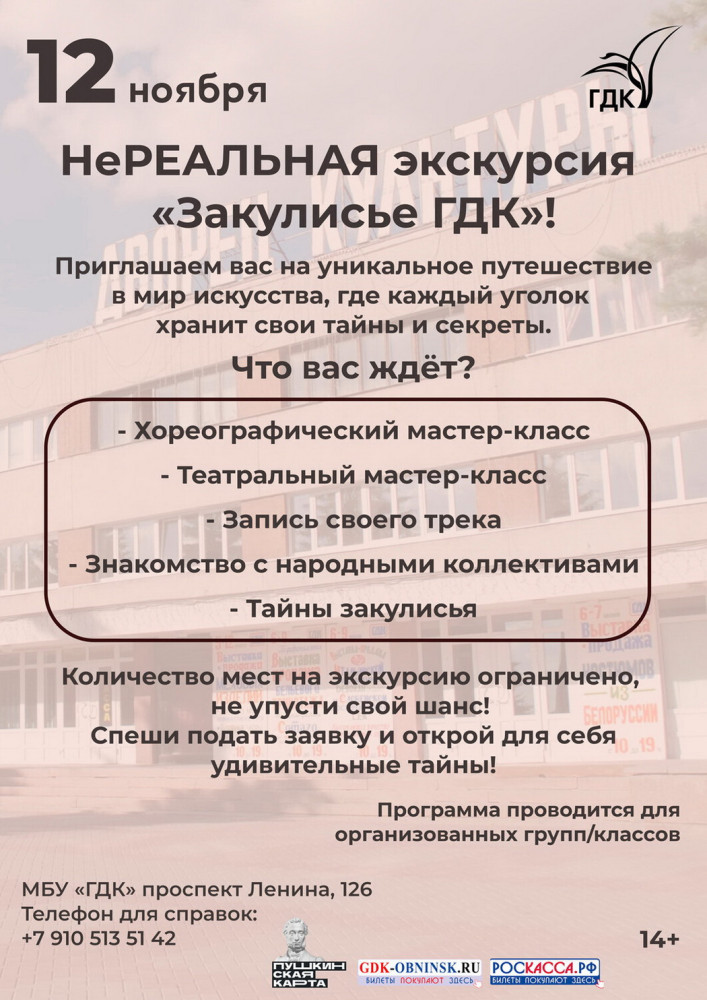 Приобрести билеты возможно онлайн, по Пушкинской карте: https://gdk-obninsk.ru/board/afisha/nerealnaja_ehkskursija_zakulise_gdk/1-1-0-847
