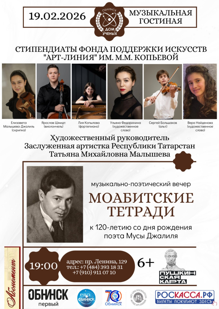 19 февраля в 19:00 в уютной Музыкальной гостиной Дома учёных состоится особенное событие — музыкально-поэтический вечер «Моабитские тетради», приуроченный к 120-летию со дня рождения легендарного поэта, Героя Советского Союза Мусы Джалиля (6+).