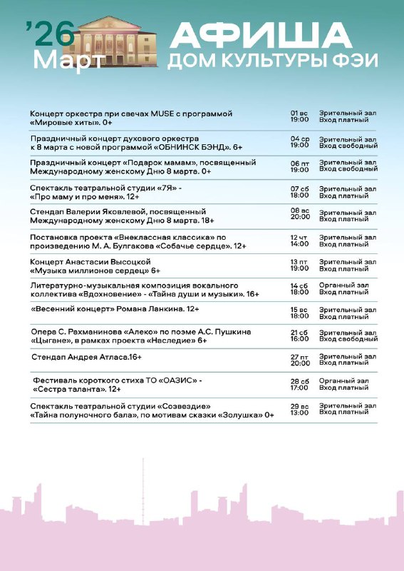 4 марта, 19:00 Праздничный концерт муниципального духового оркестра ДК ФЭИ, посвященный Международному женскому дню «ОБНИНСК БЭНД». (6+) Вход свободный