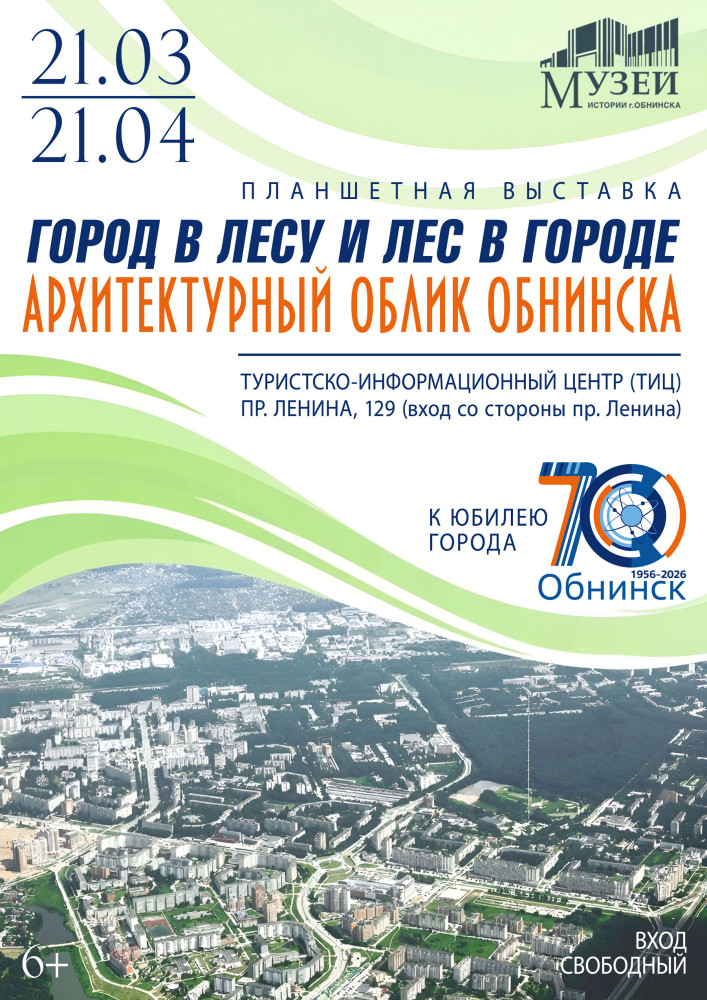 Планшетная выставка «Город в лесу и лес в городе. Архитектурный облик Обнинска» рассказывает об этапах застройки Обнинска с 1950-х годов и до наших дней, об архитектурных объектах города, об архитекторах и строителях Обнинска, благодаря которым на месте глухих лесов и болот вырос прекрасный город с просторными и светлыми улицами, тенистыми бульварами, уютными скверами и парками.