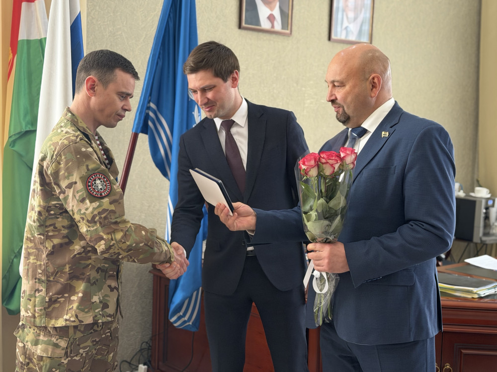 13 апреля глава города Стефан Перевалов и председатель Собрания города Обнинска Константин Пахоменко вручили медаль «Своих не бросаем» участнику специальной военной операции Роману Чикалову.