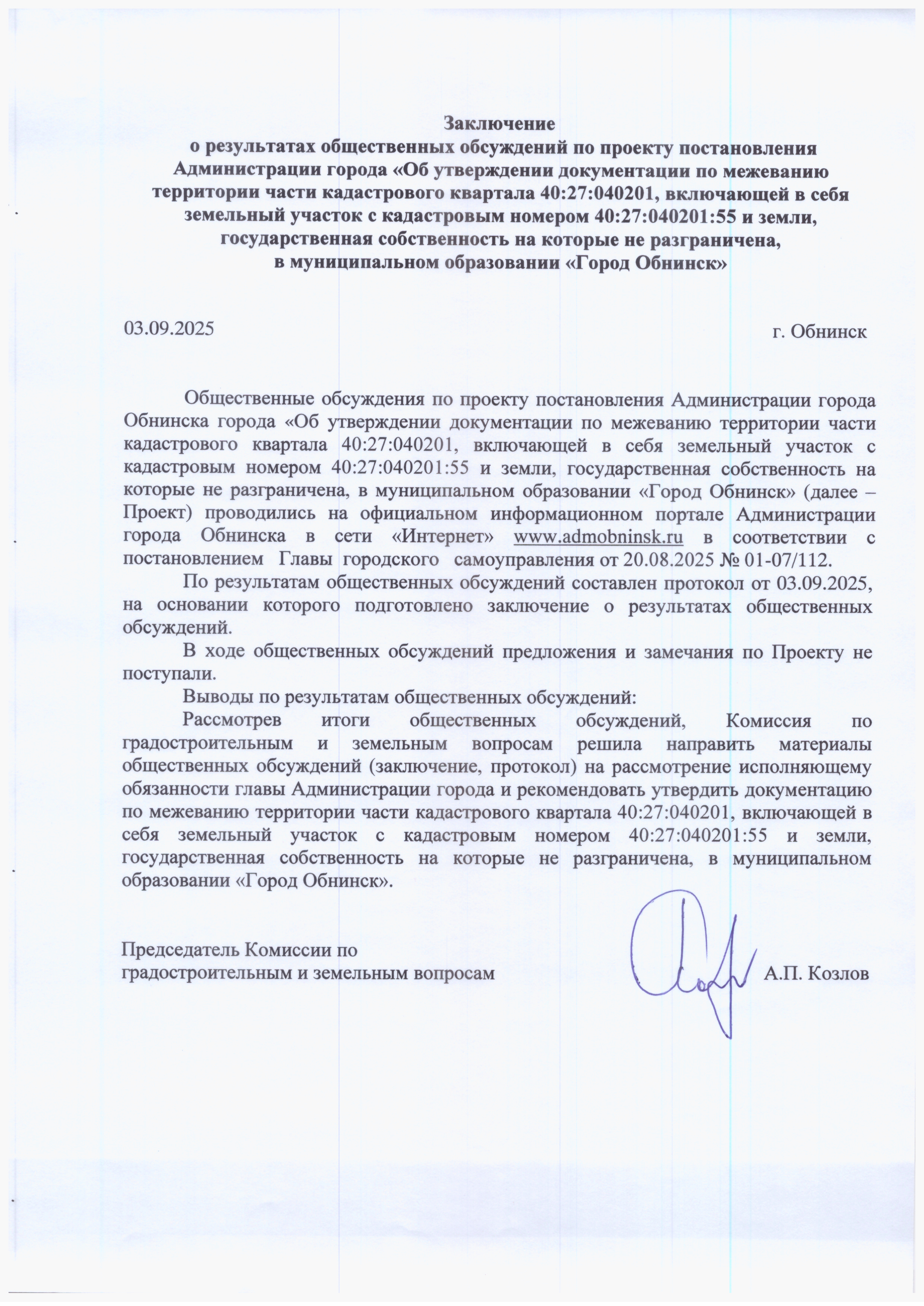 Заключение о результатах общественных обсуждений по проекту постановления Администрации города «Об утверждении документации по межеванию территории части кадастрового квартала 40:27:040201, включающей в себя земельный участок с кадастровым номером 40:27:040201:55 и земли государственная собственность на которые не разграничена, в муниципальном образовании «Город Обнинск»
