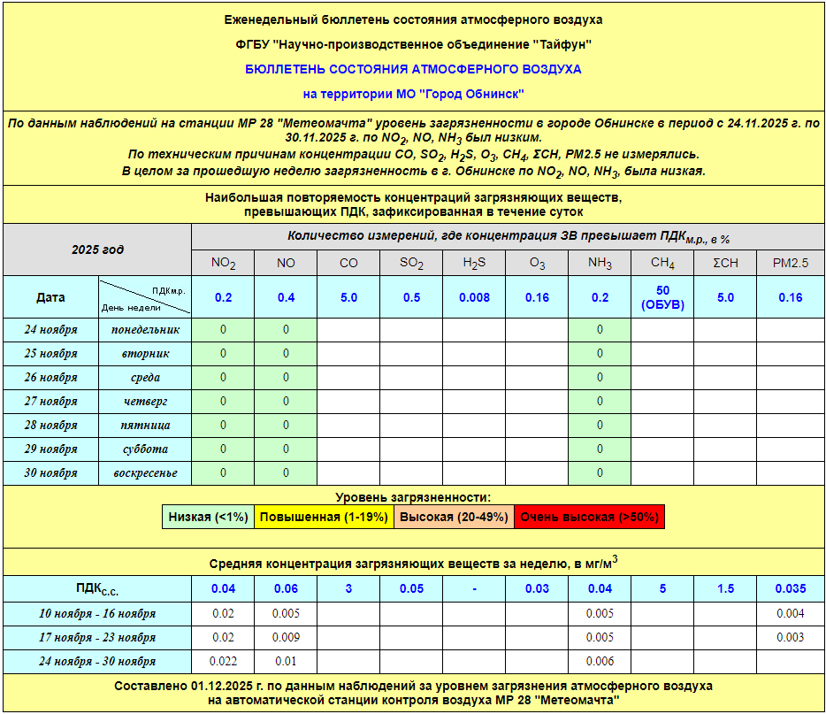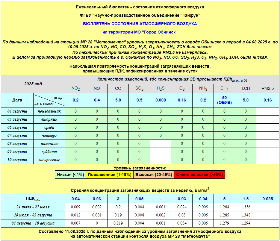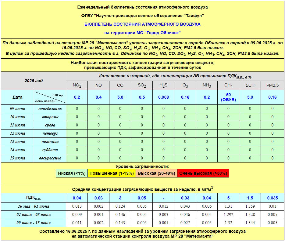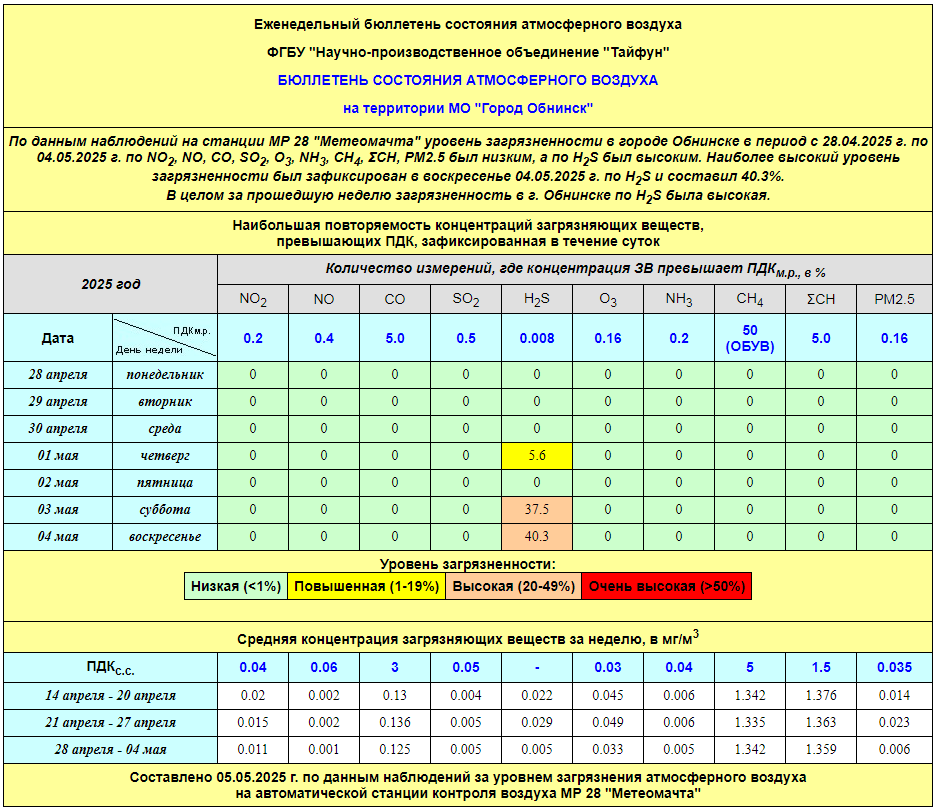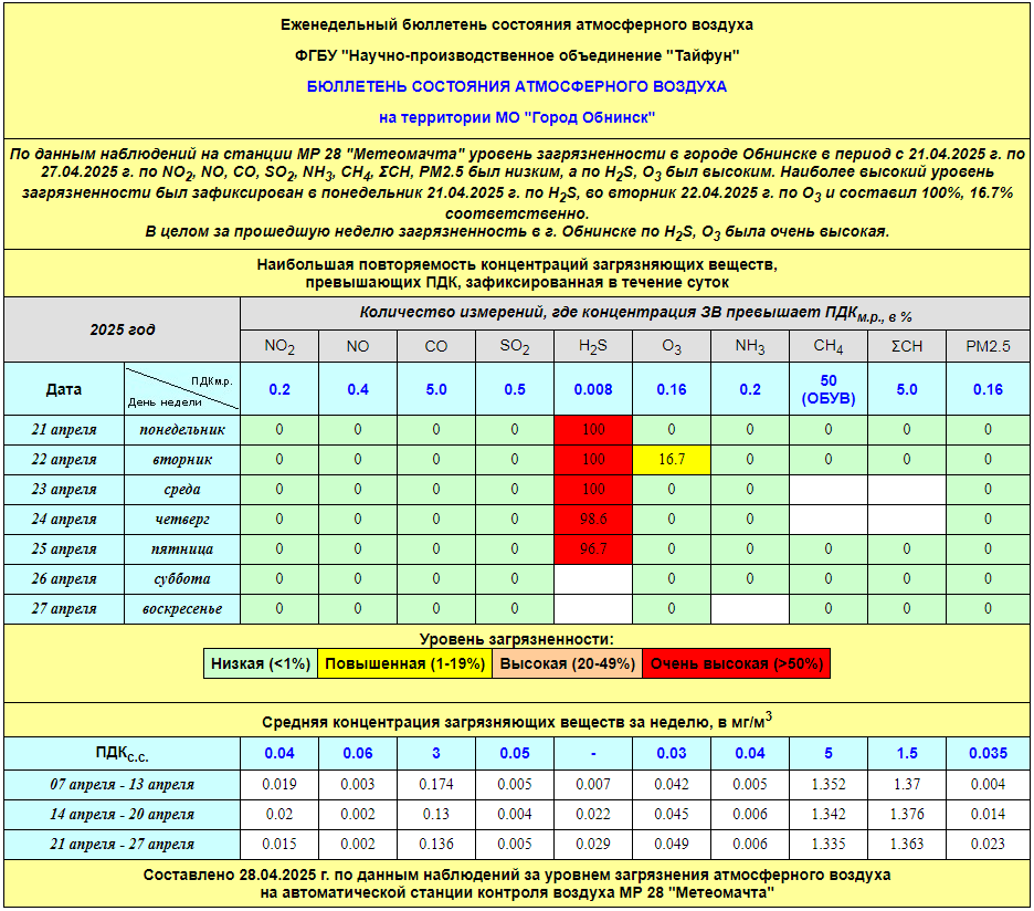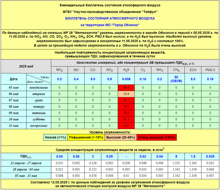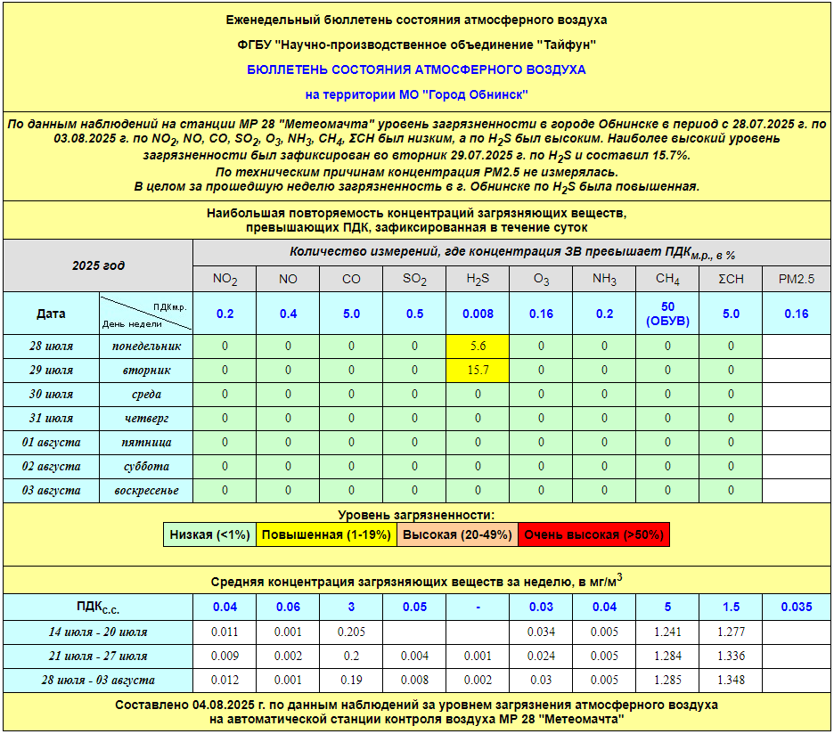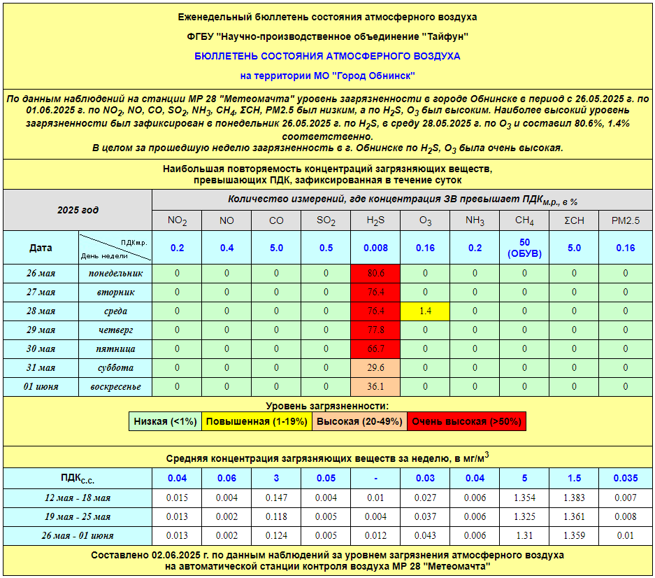 По информации, предоставленной ФГУП НПО «Тайфун», отмеченные в бюллетене состояния атмосферного воздуха на территории МО «Город Обнинск» превышения концентрации по H2S (сероводород) за период с 08.02.-12.02. связаны с некорректной работой прибора. В настоящее время проводятся работы по технической диагностике прибора.