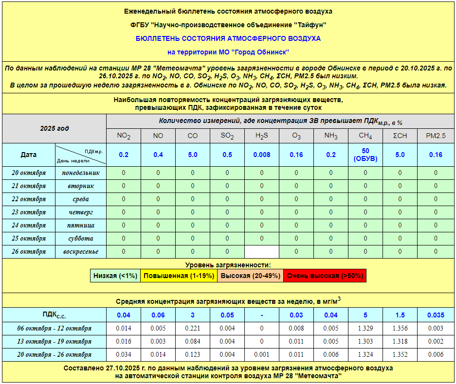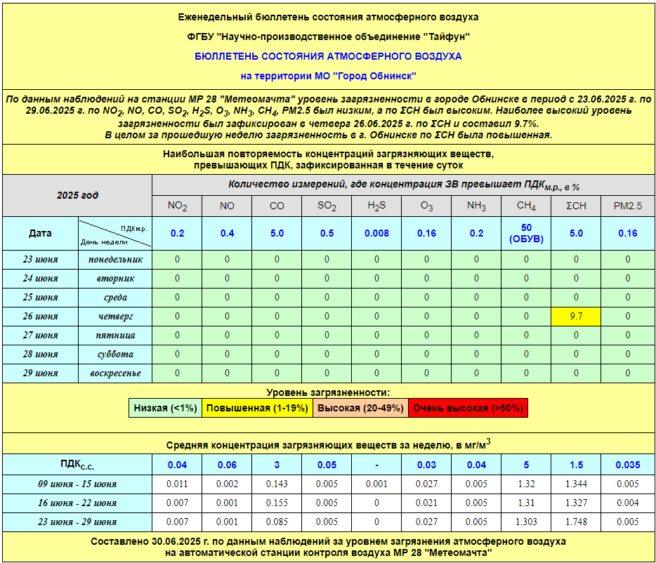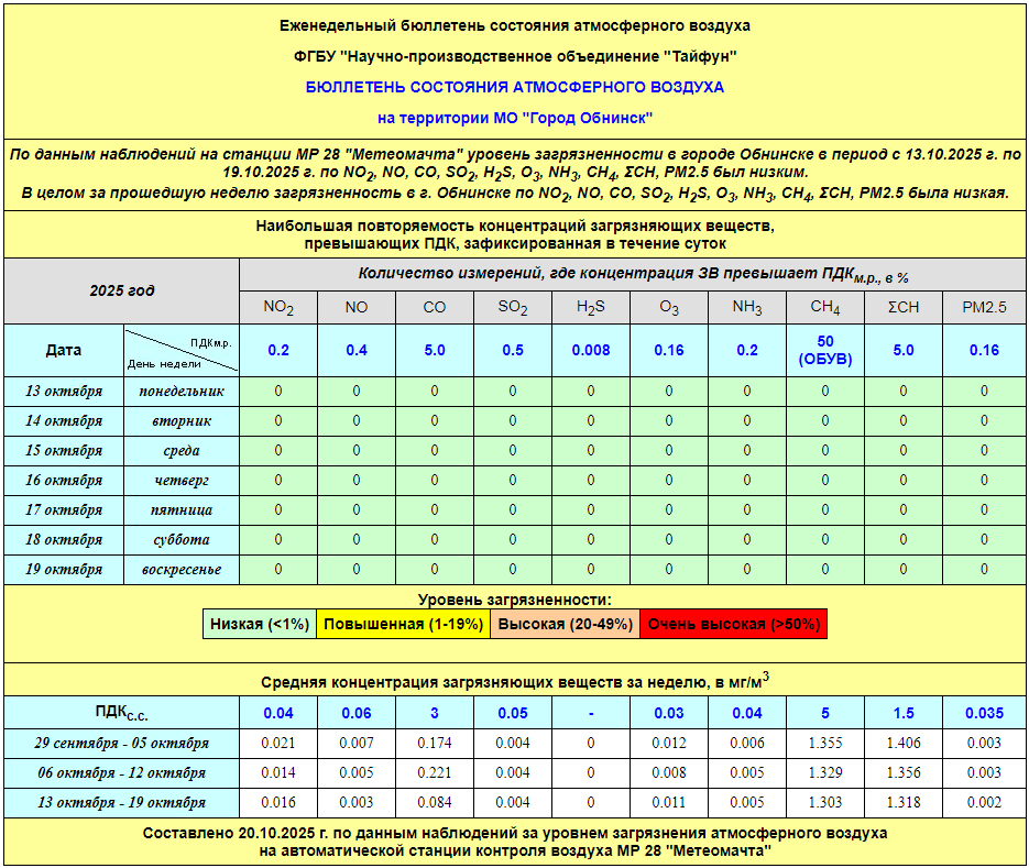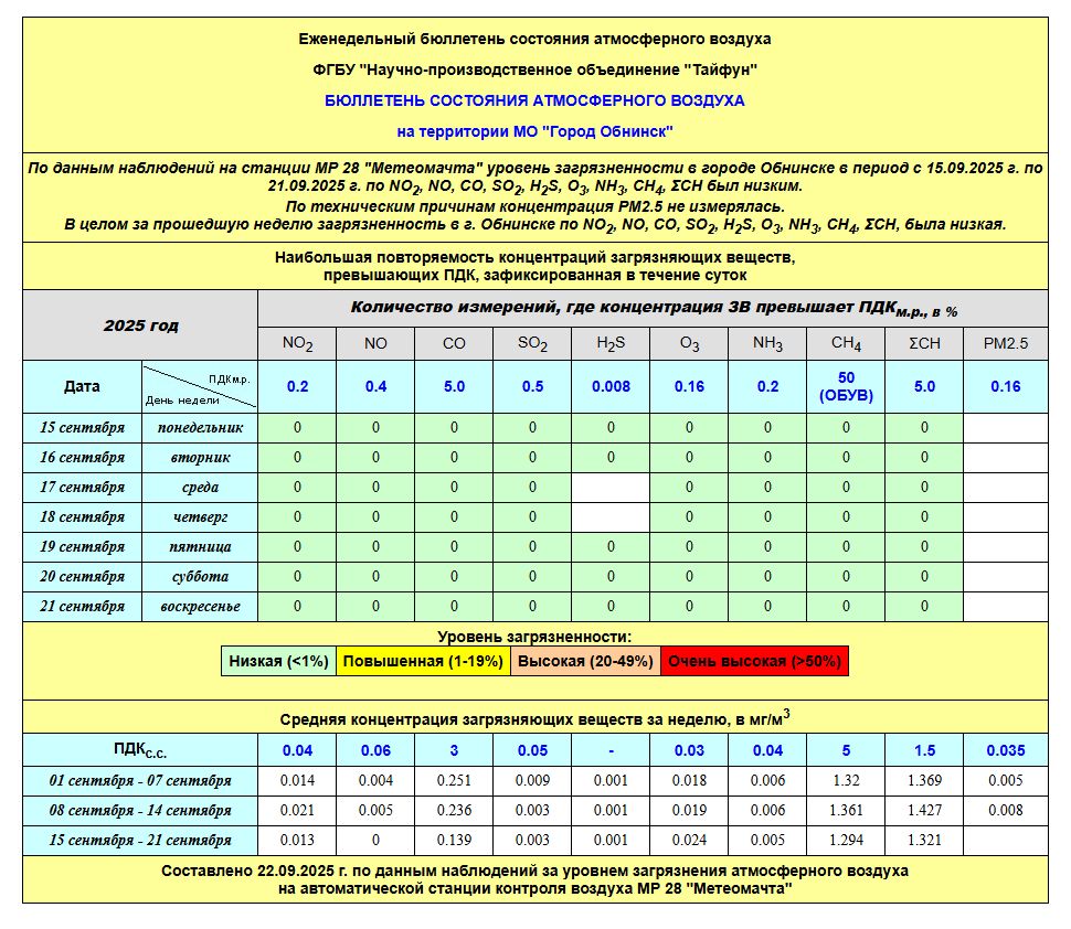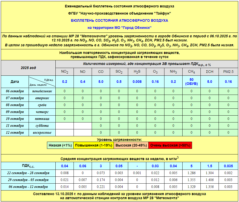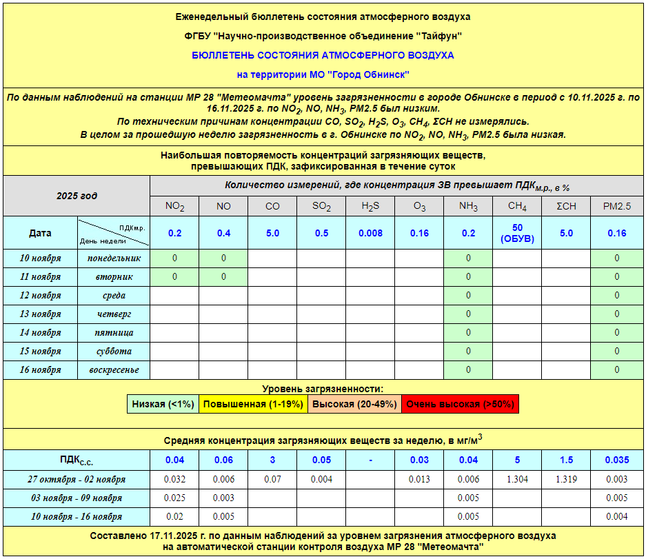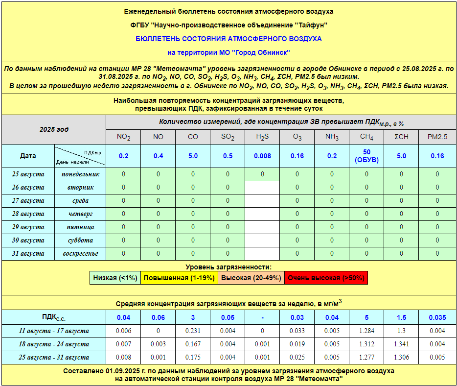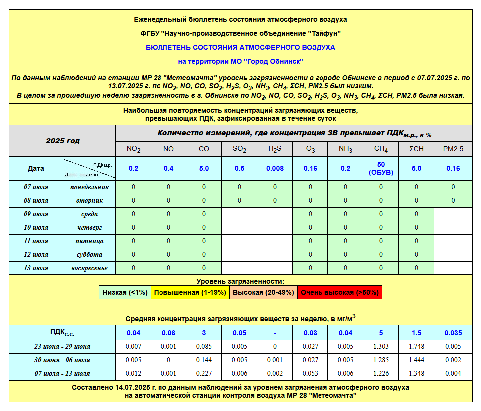 По информации, предоставленной ФГУП НПО «Тайфун», отмеченные в бюллетене состояния атмосферного воздуха на территории МО «Город Обнинск» превышения концентрации по H2S (сероводород) за период с 08.02.-12.02. связаны с некорректной работой прибора. В настоящее время проводятся работы по технической диагностике прибора.