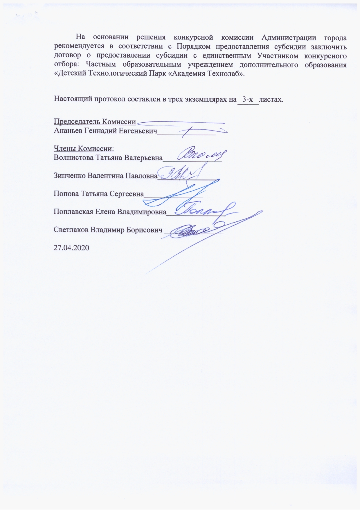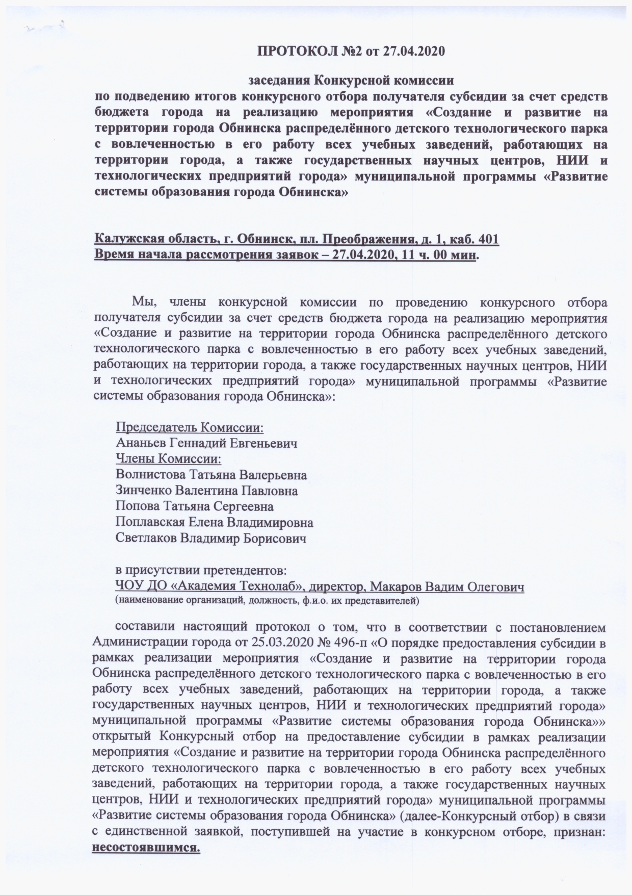 Протокол №2 от 27.04.2020 заседания Конкурсной комиссии по подведению итогов конкурсного отбора получателя субсидии за счет средств бюджета города на реализацию мероприятия «Создание и развитие на территории города Обнинска распределенного детского технологического парка с вовлеченностью в его работу всех учебных заведений, работающих на территории города, а также государственных научных центров, НИИ и технологических предприятия города» муниципальной программы «Развитие системы образования города Обнинска»