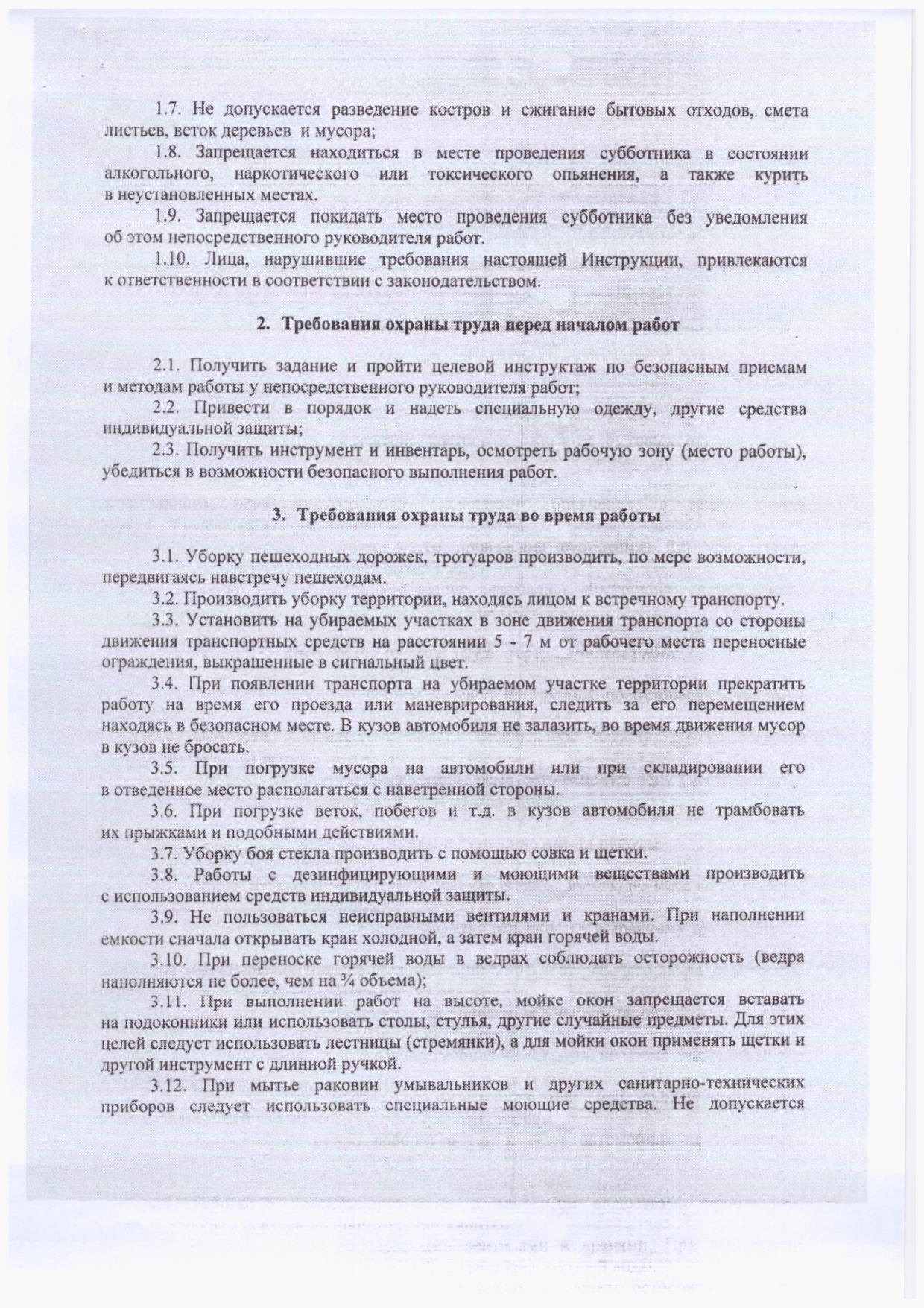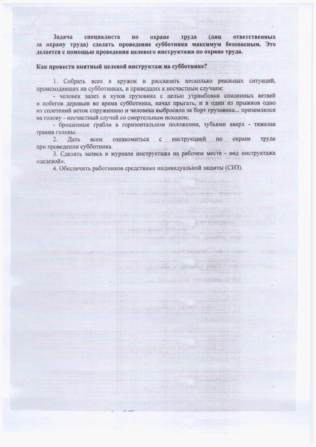 В связи с предстоящим проведением субботников и мероприятий по благоустройству территорий, министерство труда и социальной защиты области в рамках своих полномочий, установленных ст.216 Трудового кодекса Российской Федерации, и в целях обеспечения сохранения жизни и здоровья работников, напоминает о необходимости проведения целевых инструктажей по охране труда при выполнении работ, не связанных с основной деятельностью (типовая инструкция в приложении) и о необходимости использования работниками личных транспортных средств для доставки работников к месту проведения субботника и обратно. При необходимости, доставку работников рекомендуем осуществлять с использованием служебного транспорта.
