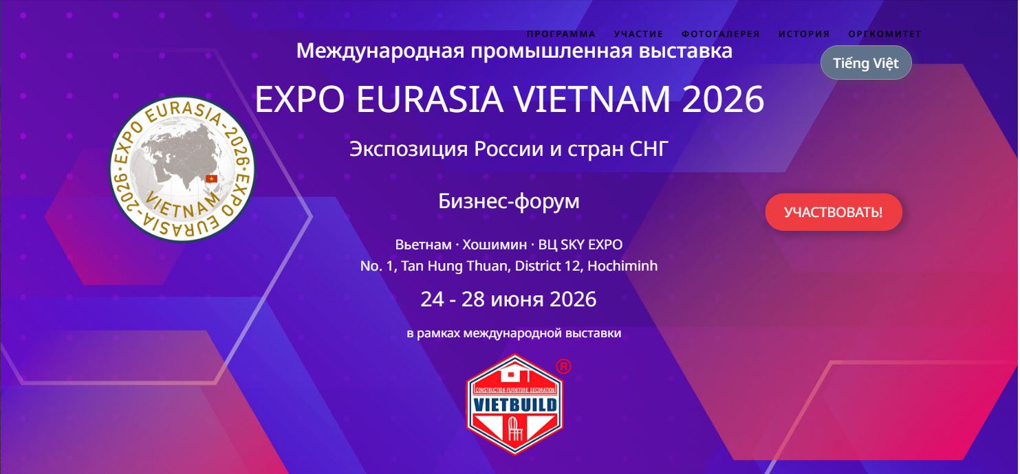 С 24 по 28 июня 2026 года в г. Хошимин (Социалистическая Республика Вьетнам) в ВЦ «Sky Expo» состоится Международная промышленная выставка «EXPO EURASIA VIETNAM 2026» и бизнес-форум в рамках международной выставки VIETBUILD 2026.