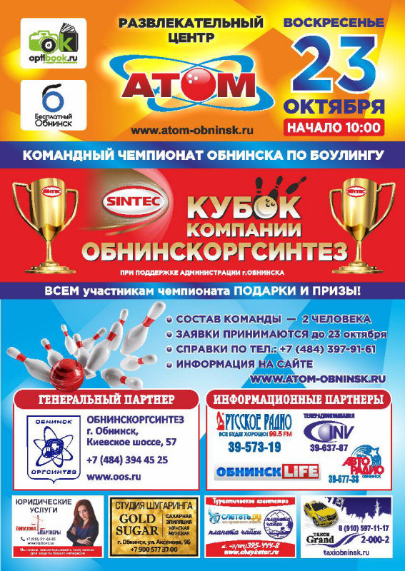Боулинг-центр "АТОМ" 23 октября проводит чемпионат по боулингу на Кубок компании "Обнинскоргсинтез"! Начало в 10 часов.