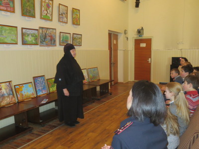Для просмотра картин и обсуждения работ были приглашены обнинские школьники. Беседу с ними провела Монахиня София. На встрече обсуждалась тема духовно-нравственного воспитания, бережного отношения к окружающей миру, охране природы, необходимости развития творческих способностей у детей.