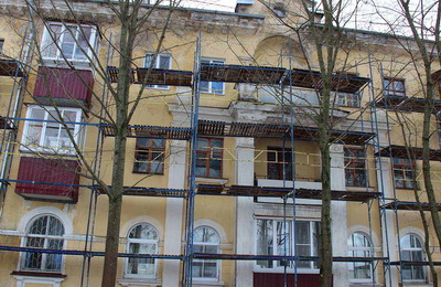 Предварительно заделаны швы в кирпичных стенах, отремонтированы балконные плиты, нанесена штукатурка. Окраска фасада выполнена вручную с лесов акриловыми составами. Поверхность стен обработана противогрибковым препаратом.