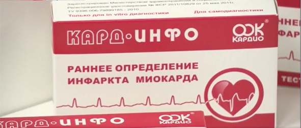 Тест-набор «КАРД-ИНФО» позволяет по 1 капле крови из пальца вне медицинской лаборатории обнаружить повреждения целостности клеток сердечной мышцы уже в первые 1-1,5 часа начала проявлений заболевания. Это единственный в России иммунохроматографический тест, действие которого основано на выявлении самого раннего кардиомаркера сБСЖК (сердечного белка, связывающего жирные кислоты) в капиллярной крови. Экспресс-диагностика инфаркта миокарда с помощью кардиотеста «КАРД-ИНФО» дает возможность избежать развития инфаркта благодаря своевременному началу специфического лечения, когда еще можно восстановить работу сердца.