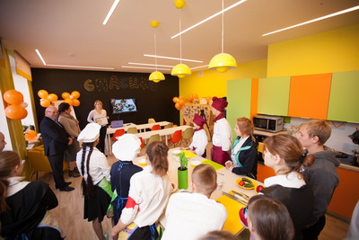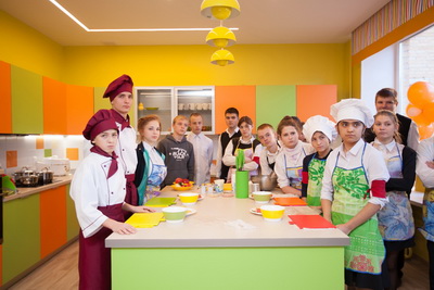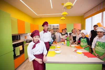 По дизайн-проекту изготовили кухонную мебель. Установлен кухонный «остров» для коллективных занятий детей по кулинарии. Кухня укомплектована необходимой бытовой техникой: холодильником, духовым шкафом, электроплитами, мультиваркой, микроволновкой, блендерами, электрочайниками. В интернат передано все необходимое для приготовления различных блюд: набор кастрюль, набор столовых приборов, ножи, разделочные доски, сервировочная посуда, сковородки и многое другое.