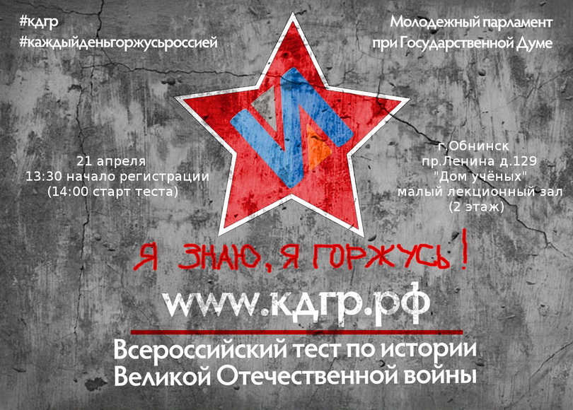 21 апреля пройдет Международный тест по истории Великой Отечественной войны. В преддверии Дня Победы сотни тысяч людей смогут проверить свои знания по истории. Мероприятие пройдет в рамках всероссийской акции «Каждый день горжусь Россией», организаторами которой является молодёжный парламент при Государственной Думе.